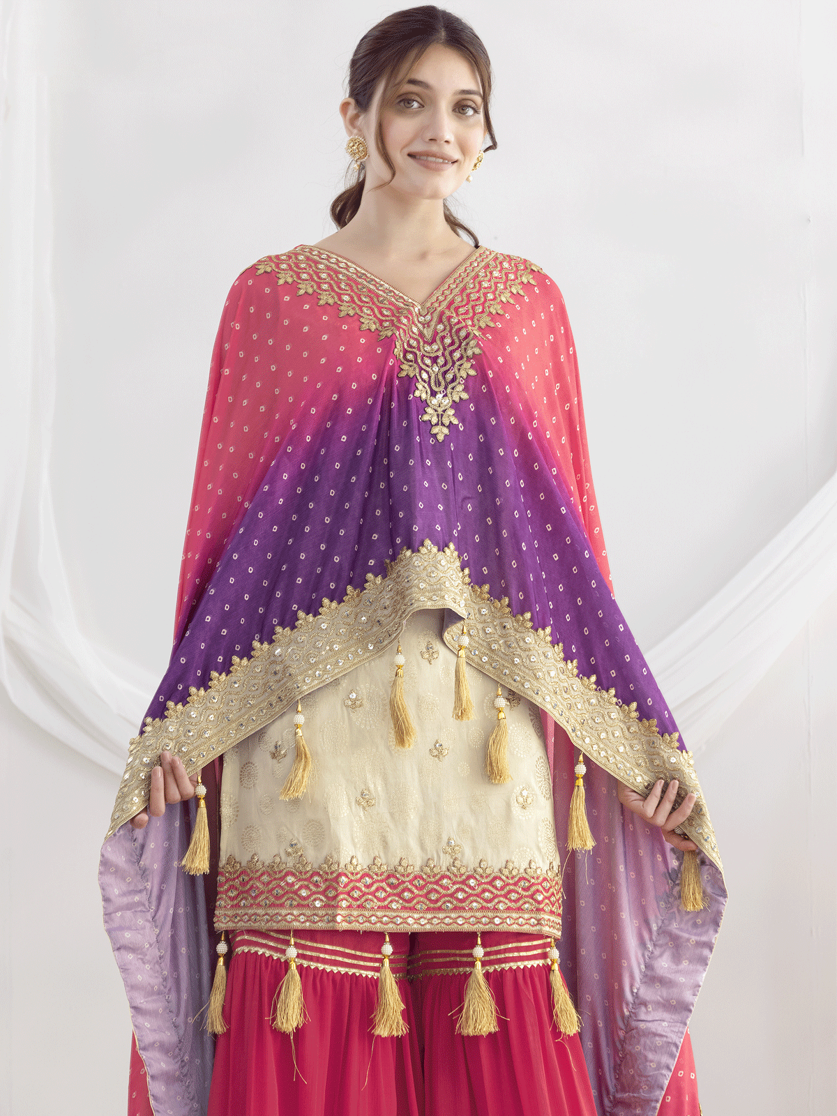 Elevate your festive wardrobe with this exquisite Cream Viscose Shimmer Jacquard Kaftan Style Gharara Dress from Inddus. The intricately embellished top showcases refined dabka dori and mirror-style sequin work, while luxurious tassels adorning the daaman add movement and elegance. Crafted from premium viscose with a subtle shimmer, this sophisticated ensemble seamlessly blends traditional craftsmanship with contemporary silhouettes, making it an ideal choice for celebrations and special occasions.