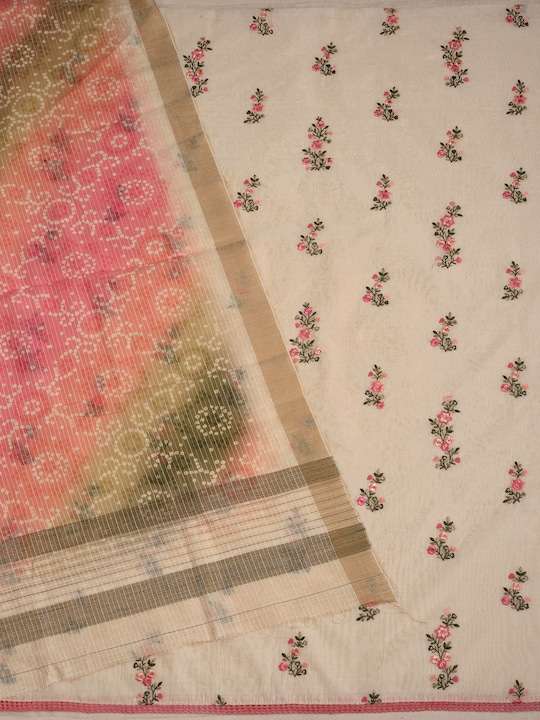 "Look stunning in this Cream Embroidered Dress Material. The cream and pink embroidery adds a touch of elegance to this unstitched dress material, while the printed dupatta with a solid border completes the look. Made of pure cotton, this dress material offers comfort and style."