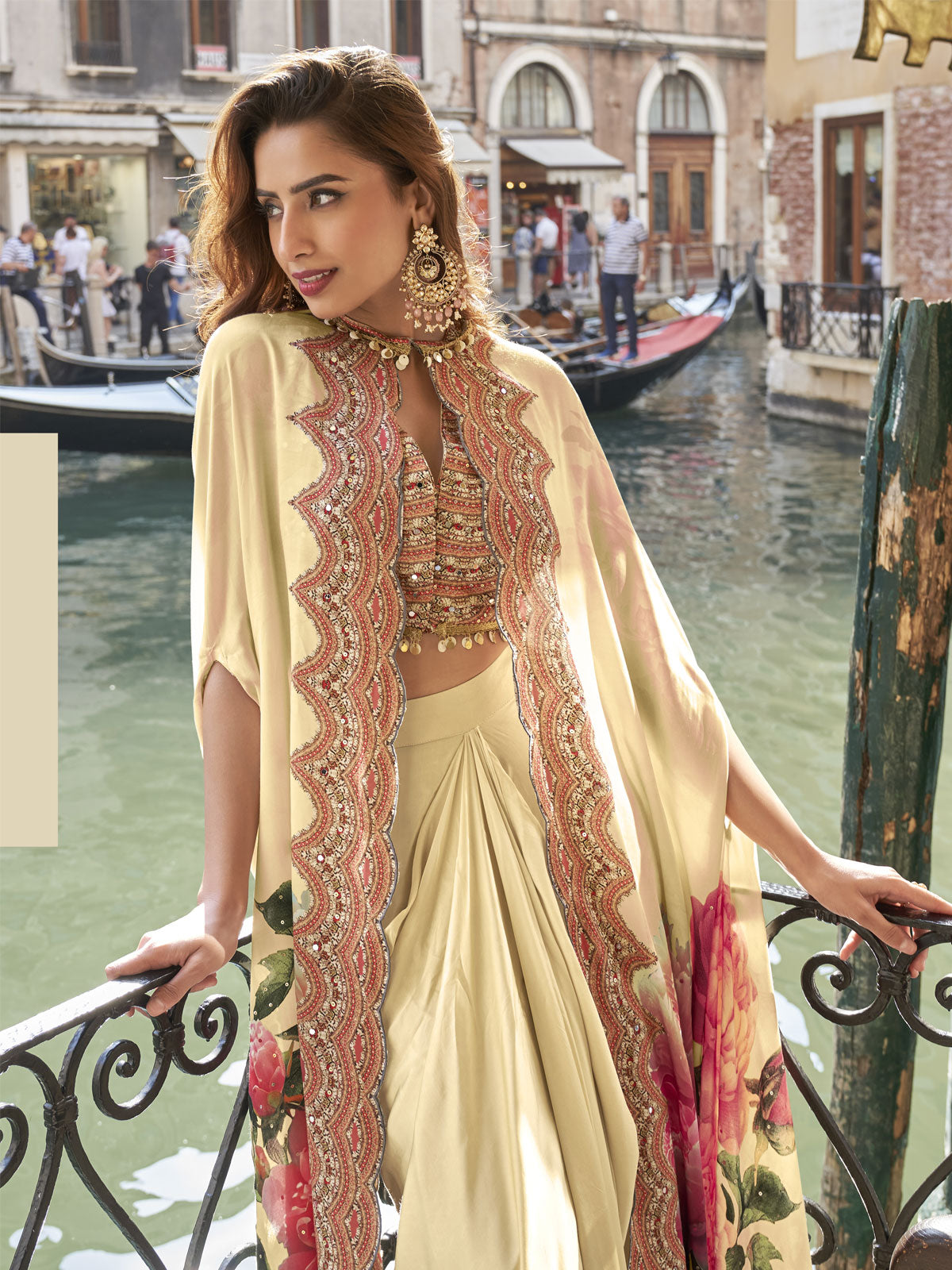 This cream salwar suit showcases refined craftsmanship through its intricate embroidered detailing on premium crepe silk fabric. The sophisticated design elevates your presence at formal occasions, delivering a polished aesthetic that commands attention. The fluid drape of crepe silk ensures comfort without compromising elegance, while the coordinated dupatta completes the ensemble with seamless style coordination.