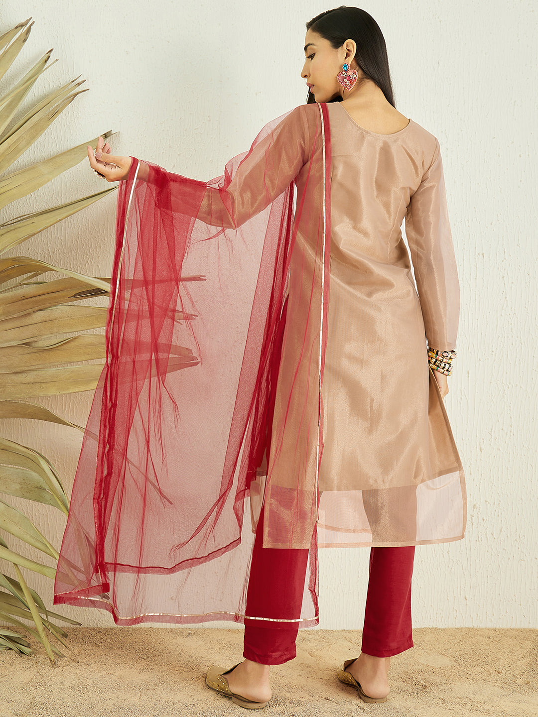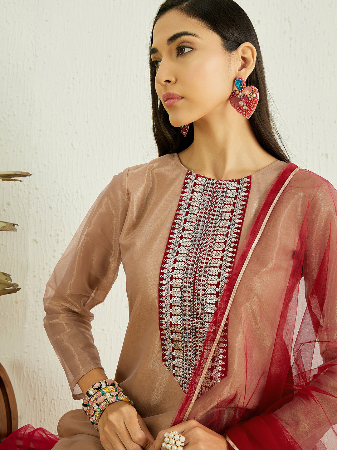This cream-colored Kurta features a beautiful ethnic motifs yoke design and elegant sequined detailing. Made from net machine weave fabric, it has a straight shape with regular style and round neck, long sleeves. The calf length kurta is complemented with solid trousers, featuring partially elasticated waistband and slip-on closure. Complete the look with the included dupatta.