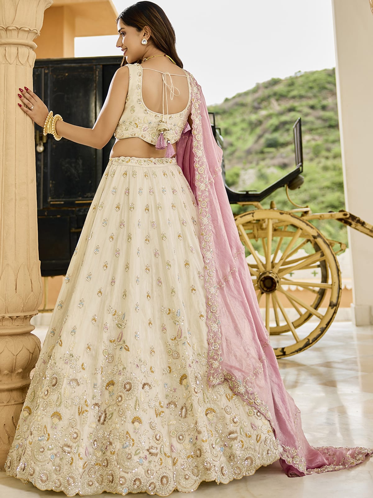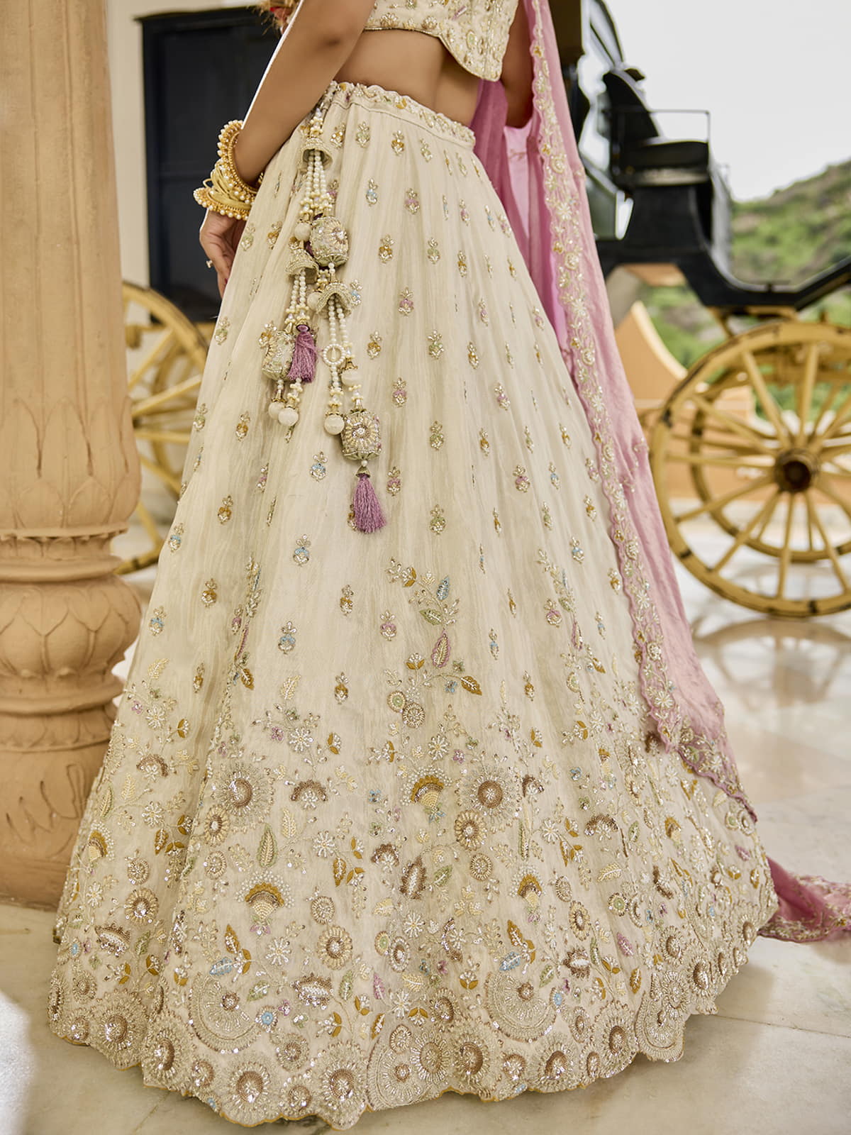 This exquisite cream tissue lehenga set exemplifies refined bridal craftsmanship with its luxurious construction and meticulous embellishment. The semi-stitched lehenga showcases premium cream tissue fabric with an impressive 4.2-meter sweep, lavishly decorated with sequins, beads, and detailed coding alongside elegant embroidery. Thread cutwork adorns the hemline with understated sophistication. The lehenga's construction features reinforced double shantoon lining combined with can-can layers (12 and 18 inches) and dual buckram supports (4 and 12 inches), delivering exceptional volume and lasting structure. The coordinating cream tissue dupatta presents heavy coding and embroidery embellishments with an intricate cutwork border, completing the cohesive ethnic ensemble. The lavender tissue blouse, designed with a flattering sweetheart silhouette, is richly embellished with sequins, coding, and thread embroidery for striking visual appeal. An integrated shantoon lining ensures comfort and durability. The semi-stitched format allows for bespoke tailoring to your individual measurements, guaranteeing a perfectly customized fit for your special occasion.