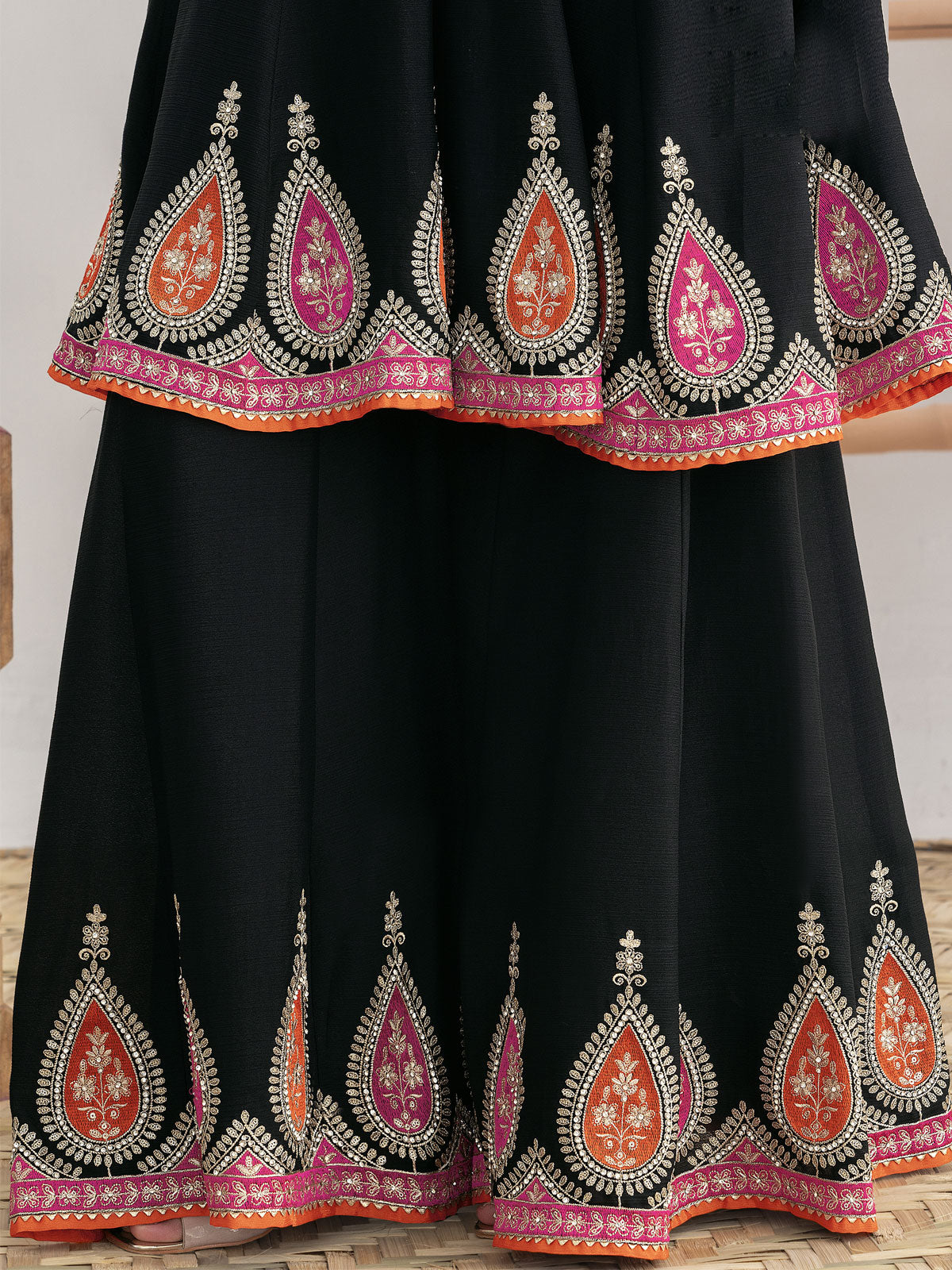 Elevate your festive wardrobe with this exquisite Cream White Multi Embroidery Anarkali Palazzo Suit, a masterpiece of traditional craftsmanship. The round-cut anarkali top showcases intricate embellishments—golden zari, resham thread, crystal stones, and sequins—creating a luminous, celebratory aesthetic. Crafted from premium chinnon silk with soft satin lining, the ensemble ensures both elegance and comfort throughout your occasion. The coordinating palazzo bottom features delicate ghera embroidery, while the matching dupatta is adorned with butti motifs and a refined zari lace border. This sophisticated ensemble is designed for the discerning wearer seeking authentic desi elegance. Style with gold jewellery and heels for a timeless, polished finish.