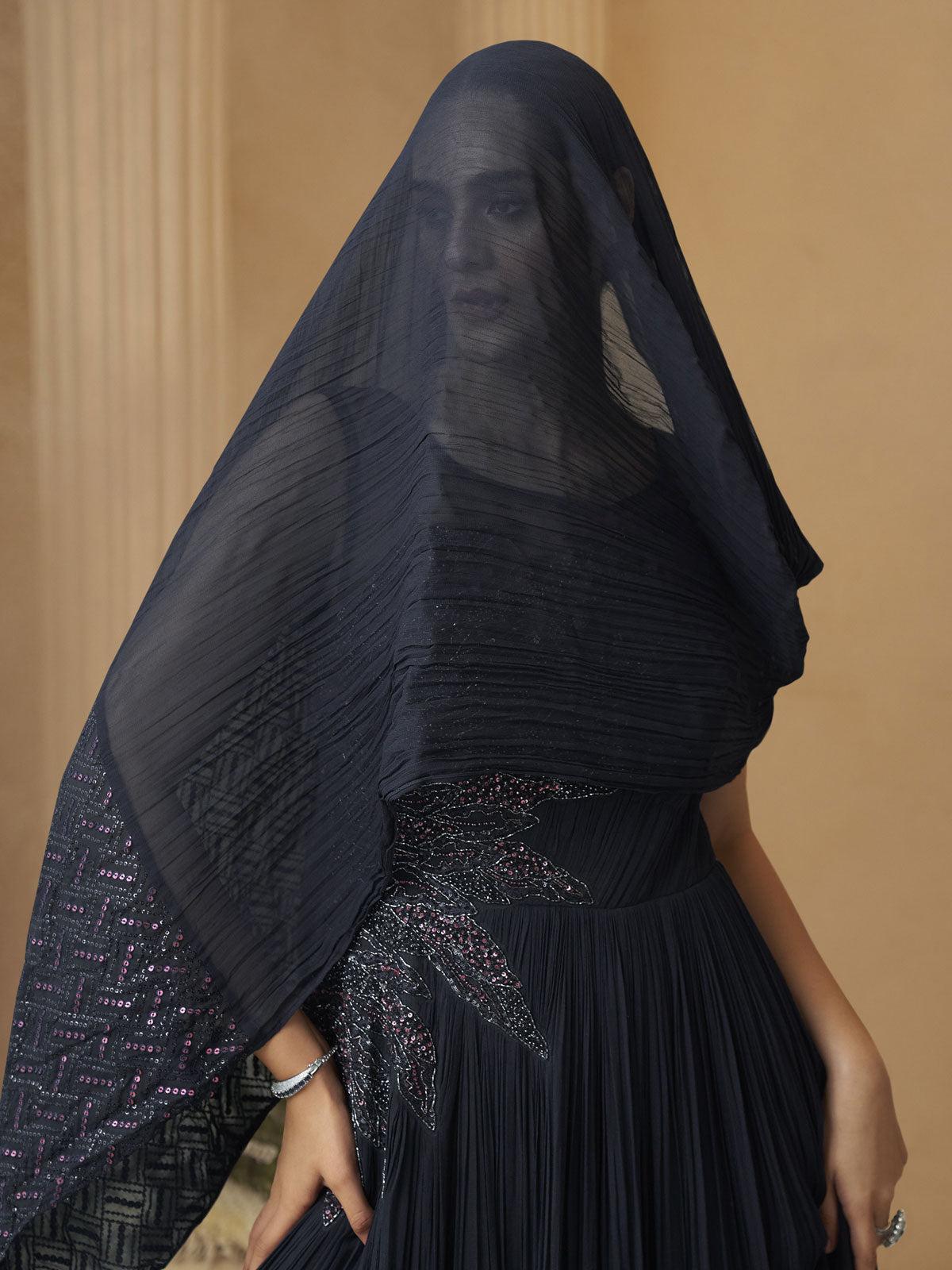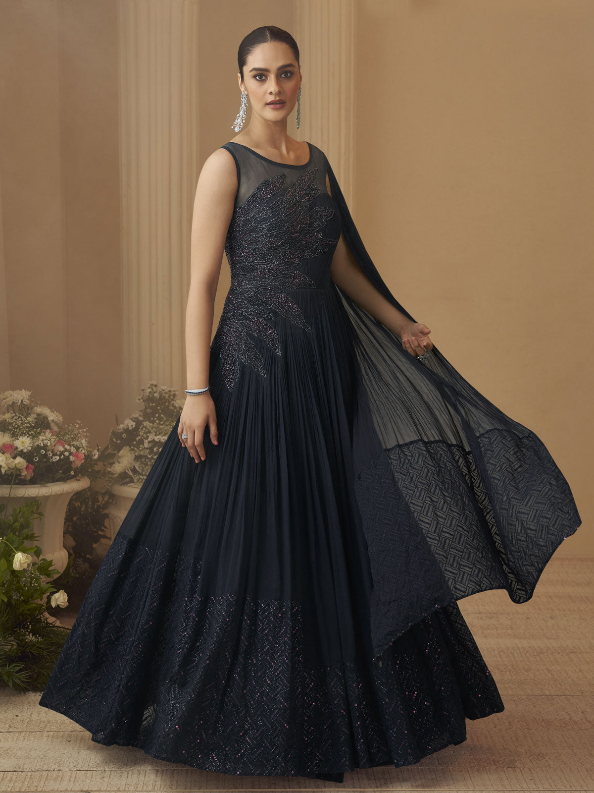 This exquisite Dark Blue Hand Embroidery Anarkali Gown showcases masterful craftsmanship through its premium chinnon silk construction and intricately detailed yoke. Adorned with resham thread, sequins, and fine beads, the embroidery work creates a sophisticated visual narrative across the garment. The asymmetrical one-shoulder design introduces contemporary elegance while the gracefully flared silhouette delivers a luxurious drape that moves with refined poise. Perfect for receptions, wedding celebrations, and upscale festive occasions, this gown balances ornamental richness with understated refinement. The full-length cut ensures a polished presentation when paired with statement jewelry and complementary footwear. Available up to size 40-42; contact us for plus-size customization. Includes complimentary international shipping.