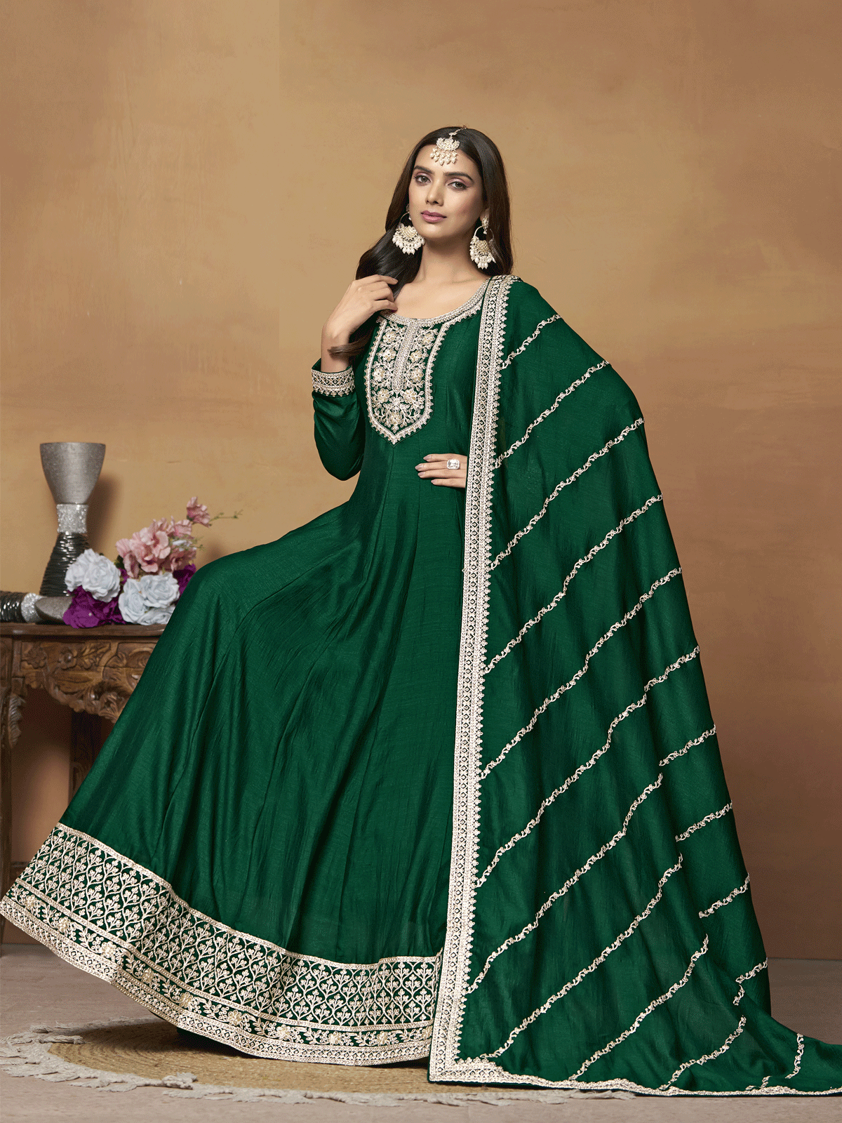 Enhance your festive look with our mystical Green Georgette Festive Wear Anarkali Suit. Crafted from georgette fabric, this radiant anarkali gown set comes with a luxurious art silk dupatta and comfortable santoon bottom. Perfect for any occasion, dazzle in this stunning anarkali suit from Inddus.