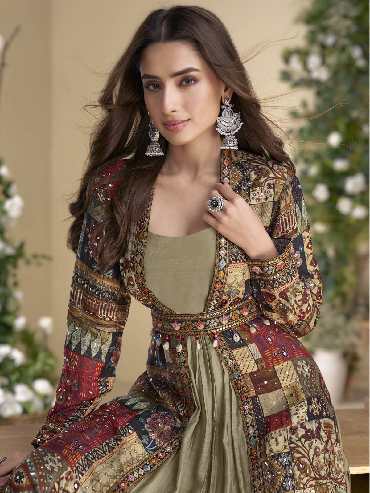 Elevate your festive wardrobe with this exquisite Anarkali gown crafted from soft golden beige georgette. Featuring intricate patchwork and paired with a vibrant multicolor printed long jacket, this ensemble blends traditional elegance with contemporary flair. Ideal for Indian weddings, Pakistani parties, and Mehndi celebrations, it offers both comfort and style for memorable occasions.