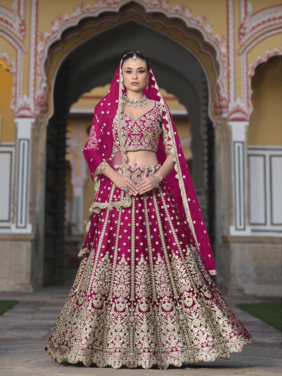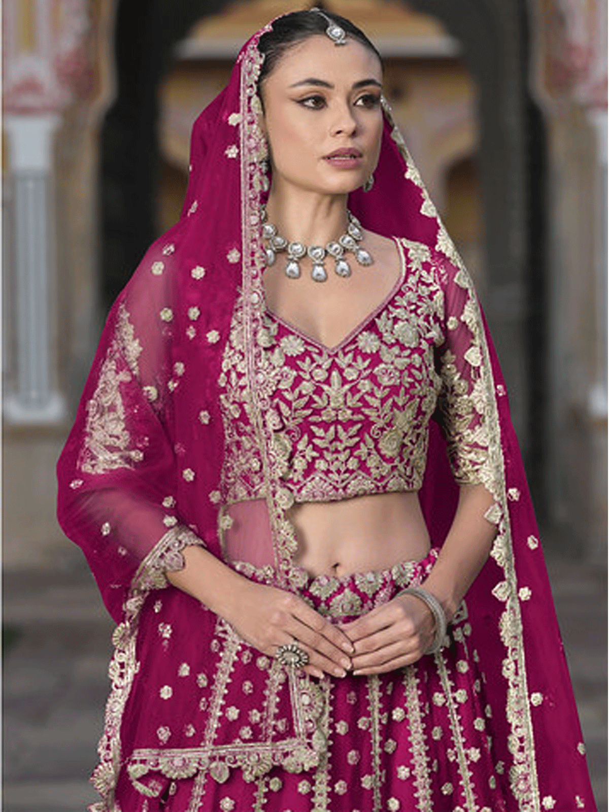Embrace timeless elegance with this Designer Pink Net Embroidered Wedding Lehenga Choli from Inddus. Meticulously crafted with intricate zari work, fine threadwork, shimmering sequins, and sparkling stone embellishments, this ensemble captures the essence of bridal sophistication. The delicate net fabric drapes beautifully, while the coordinating embroidered blouse and ethereal dupatta complete the look with refined charm. Ideal for weddings and grand celebrations, this lehenga choli commands attention with its exquisite detailing and graceful silhouette. Pair with traditional jewelry to enhance your bridal presence and create an unforgettable impression.