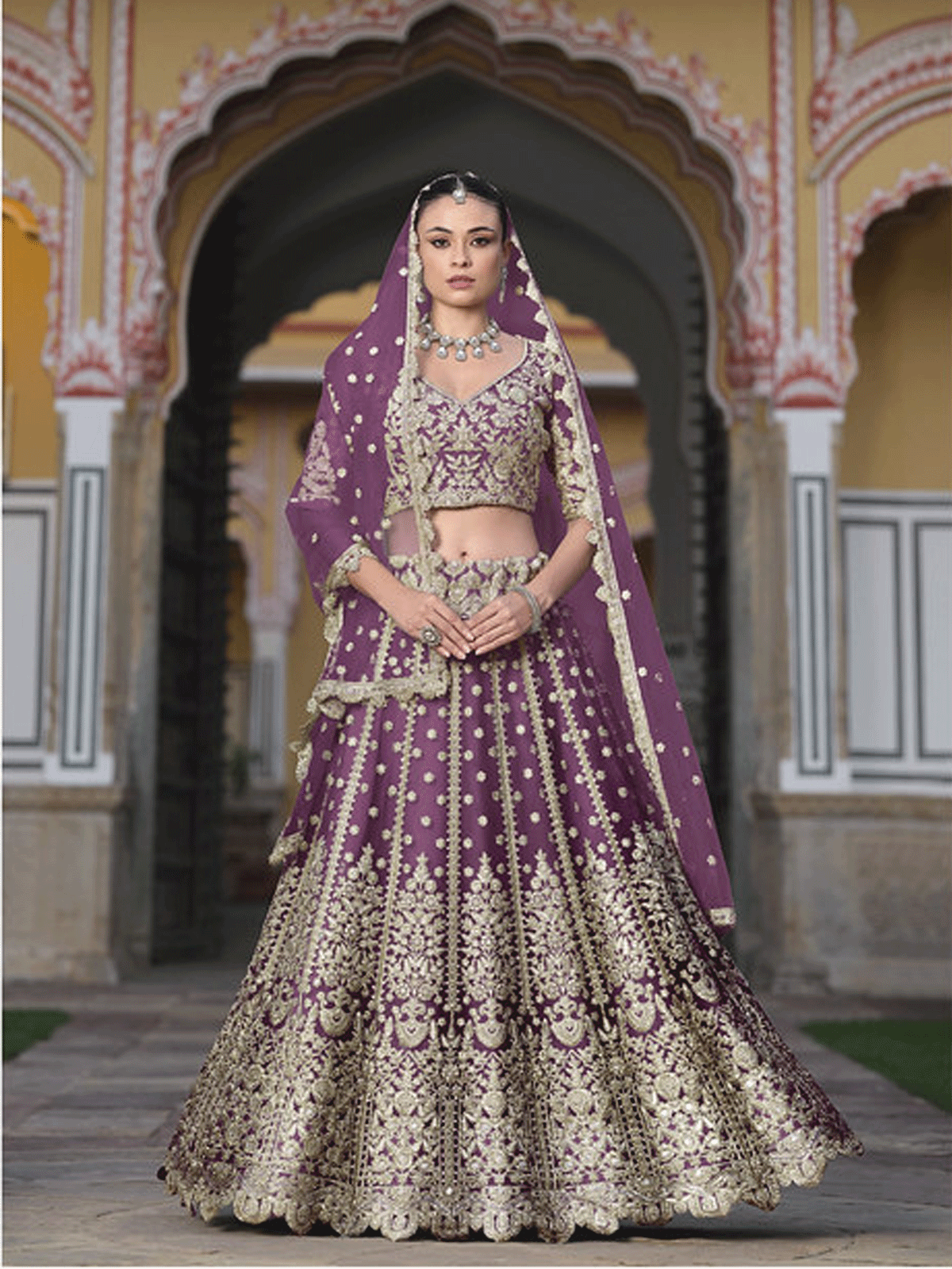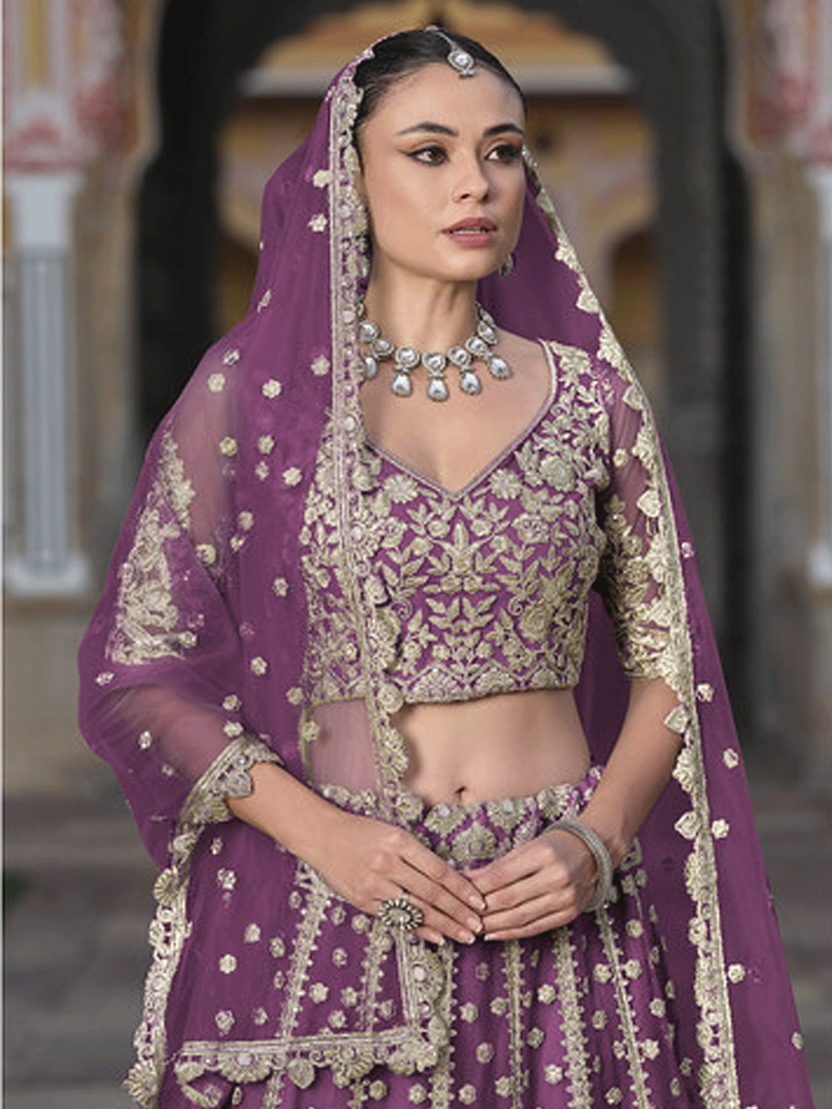 Experience the pinnacle of bridal elegance with this Designer Purple Net Embroidered Wedding Lehenga Choli from Inddus. Meticulously crafted with intricate zari embroidery, fine threadwork, sequins, and stone detailing, this three-piece ensemble delivers unparalleled sophistication. The luxurious net fabric drapes beautifully, while the coordinated embroidered blouse and dupatta complete a cohesive, show-stopping look. Ideal for weddings and grand celebrations, this lehenga choli combines traditional craftsmanship with contemporary design sensibilities. The rich purple hue and ornate embellishments ensure you radiate timeless grace and commanding presence. Style with heritage jewelry to create an unforgettable bridal statement.
