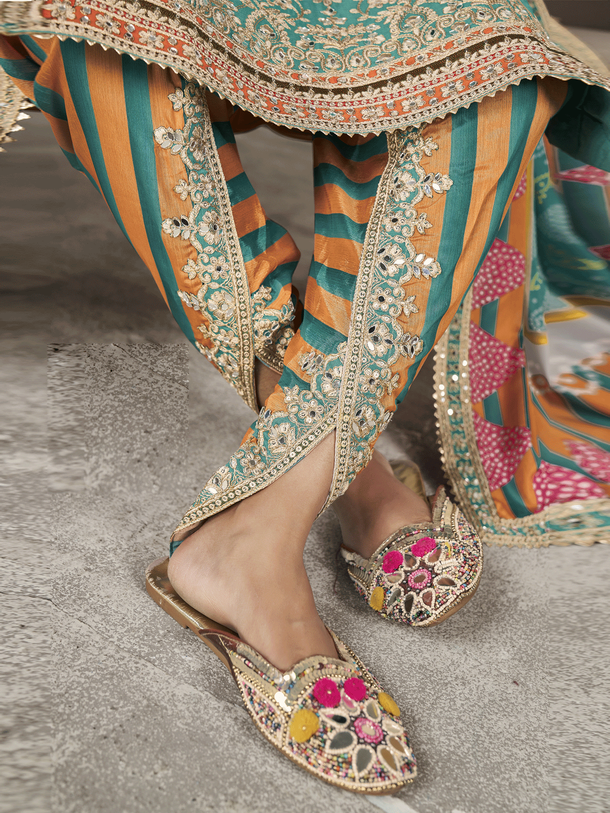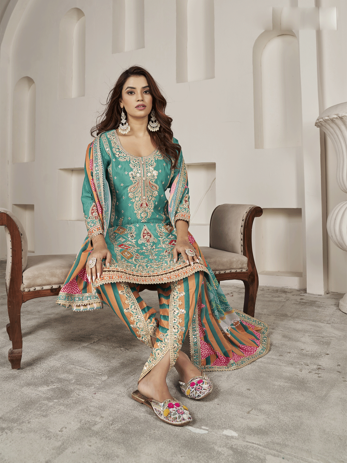 Embrace timeless elegance with this Designer Sea Green Punjabi Style Dhoti Style Salwar Suit, crafted from luxurious fiber chinnon fabric. This exquisite piece showcases meticulous craftsmanship with intricate dabka dori threadwork, shimmering sequins, and handmade mirror embroidery that catches light beautifully. The ensemble includes a coordinating chinnon dupatta adorned with digital print and an ornate handwork border, while the distinctive dhoti-style tulip pant creates a flattering silhouette. Ideal for weddings, festivals, and special celebrations, this suit seamlessly blends traditional Punjabi aesthetics with contemporary design. Pair with traditional jewelry and accessories to complete your sophisticated, show-stopping look.