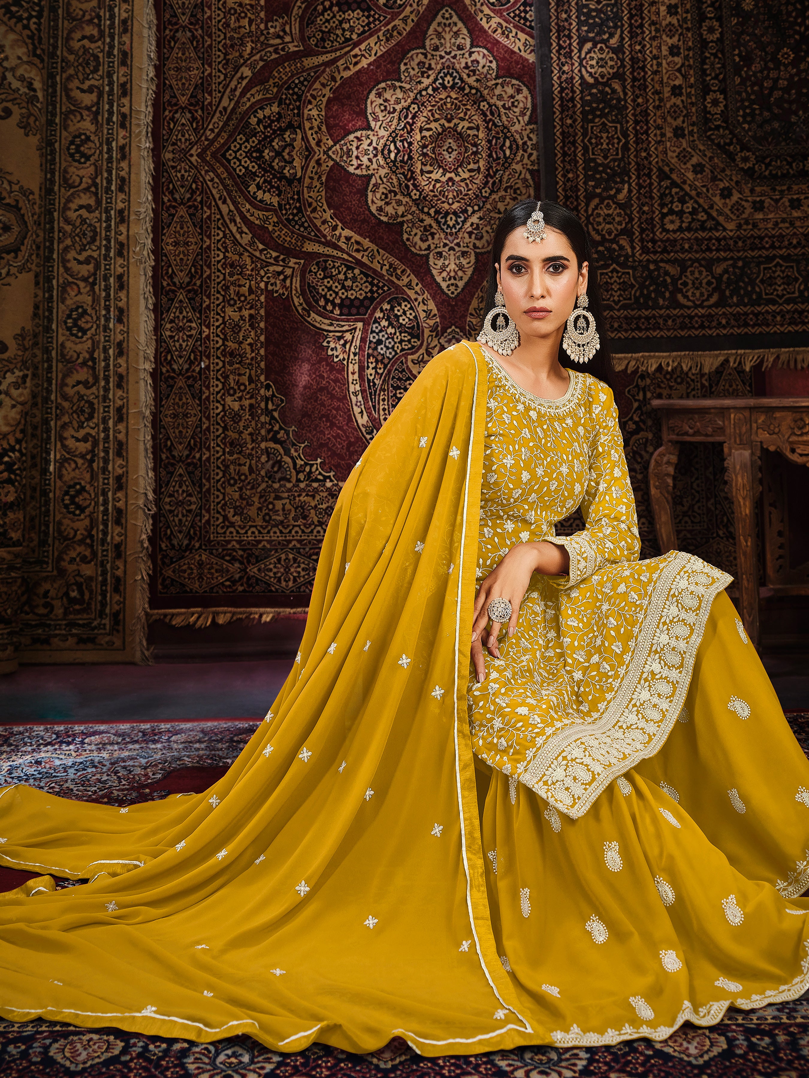 Buy elegant yellow georgette partywear sharara-style-suit online at best shopping price. This elegant set comprises a georgette sharara suit with matching georgette dupatta and georgette bottom.