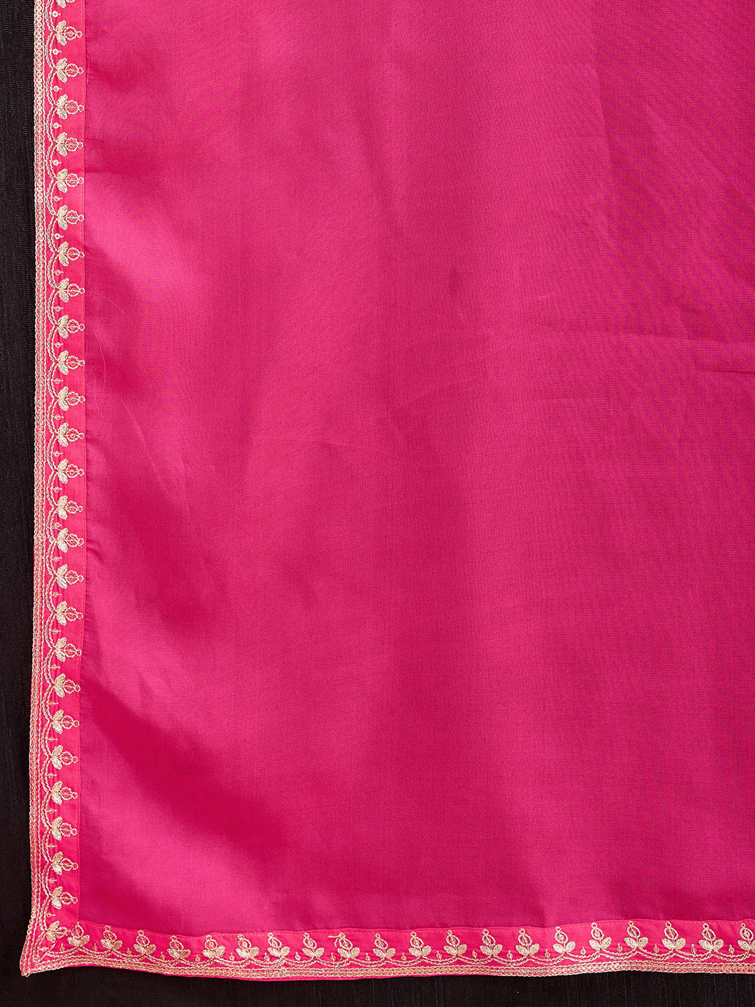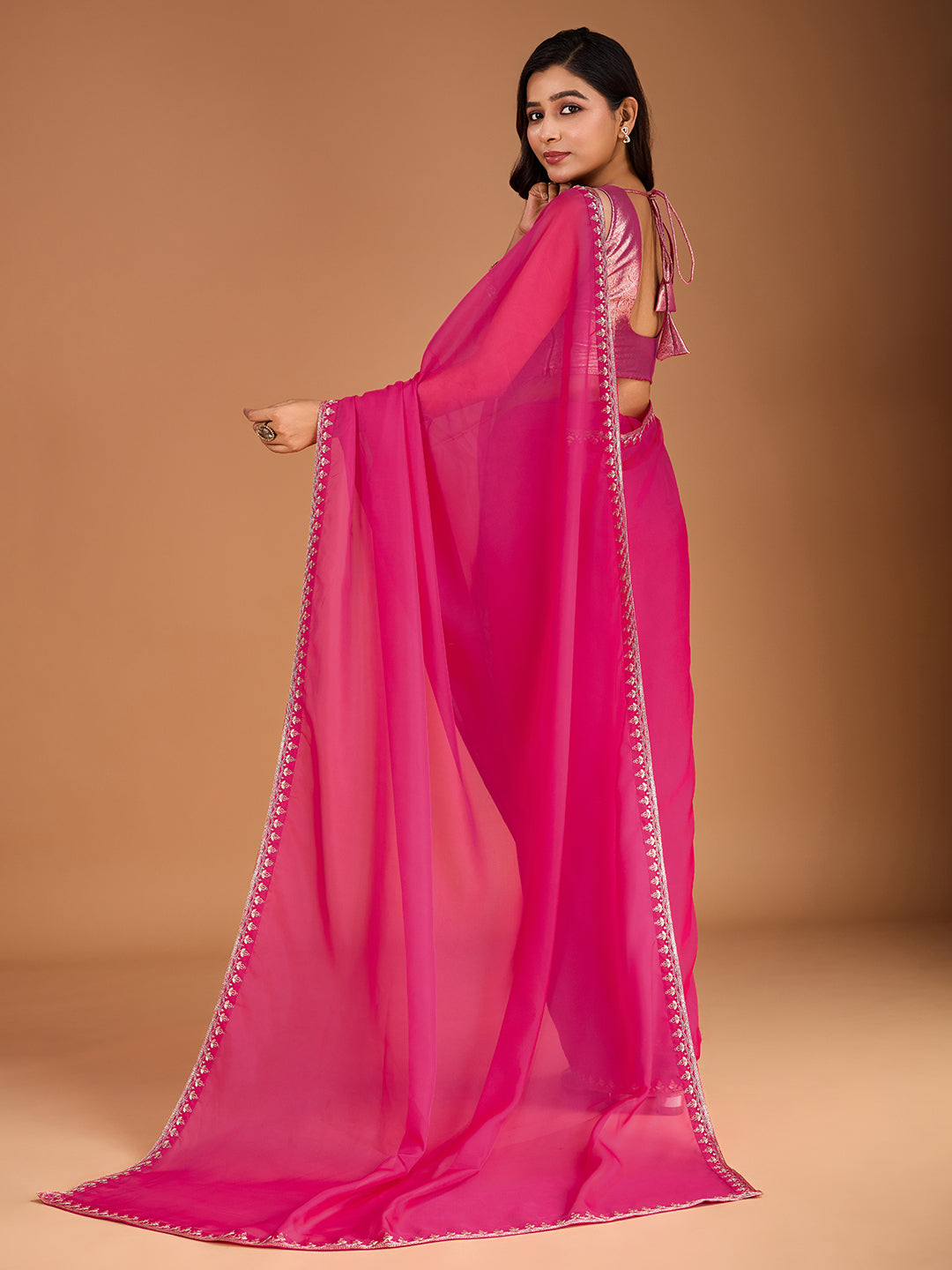 Elevate your style with our Pink Embellished Sequinned Organza Saree. This solid saree features a stunning embellished border with delicate sequinned details. The saree comes with an unstitched blouse piece, for you to create the perfect fit. Make a statement at any occasion with this exquisite piece!
