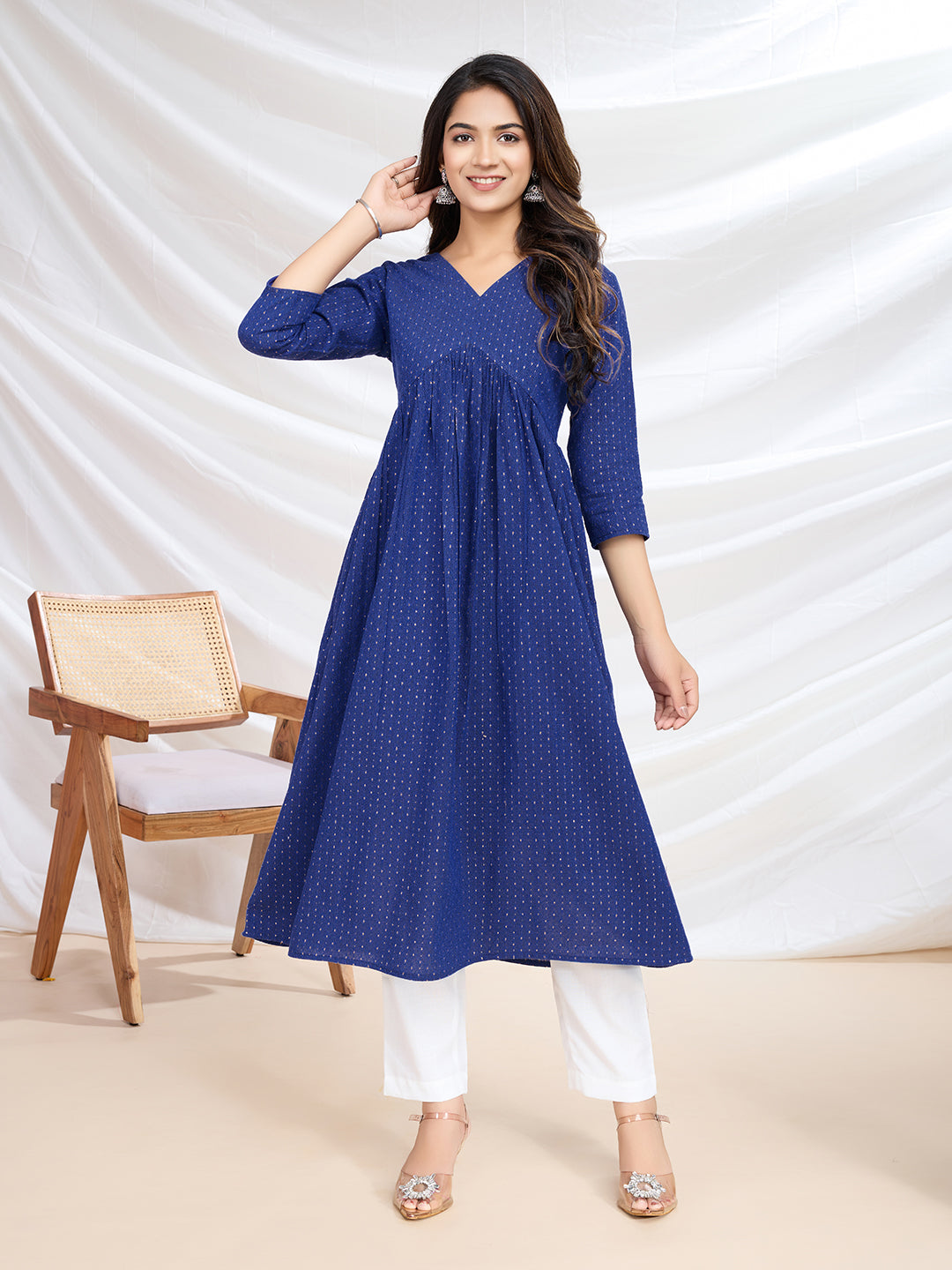 Expertly designed V-neck three-quarter sleeve kurta in a beautiful blue hue. Features exquisite embellishments, a flattering A-line shape with pleated details, and a calf length with a graceful flared hem. Made from top-quality machine-woven regular cotton for everyday comfort. Perfect for adding a touch of elegance to your wardrobe.