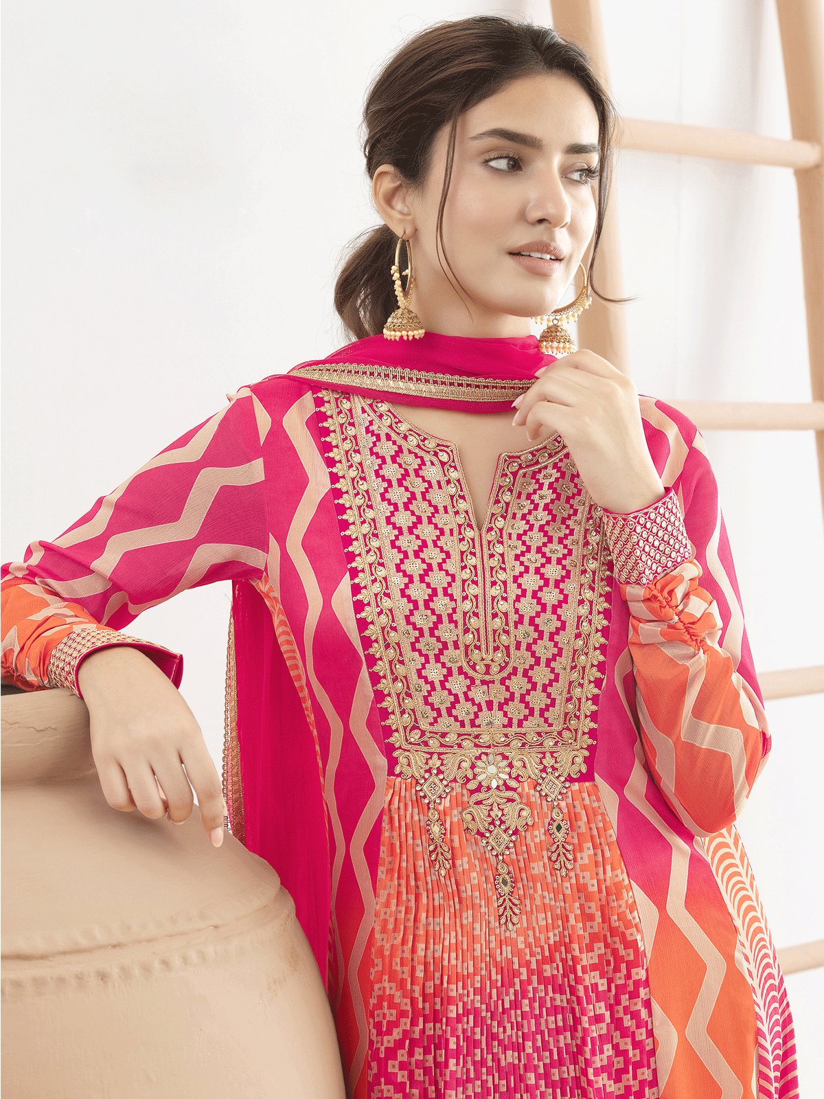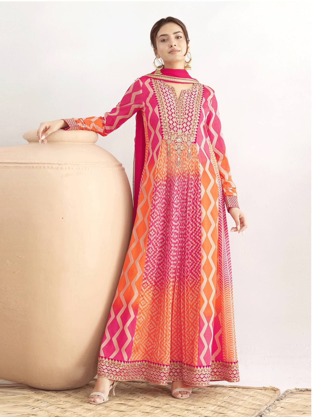 Elevate your ethnic wardrobe with this stunning Chinon Chiffon Abaya Style Kameez, masterfully crafted in complementary pink and orange hues. The readymade ensemble features a notched round neckline and full sleeves, lined with soft Shantoon for comfort and durability. Intricate embellishments including digital print, zari work, stones, sequins, and mirror detailing create a sophisticated, festive look perfect for celebrations and special occasions. This three-piece set includes a Lycra Leggings in vibrant fuchsia and a flowing Viscose Chiffon Dupatta in pink. With a kameez length of 54 inches and leggings length of 44 inches, this piece offers an elegant silhouette. Please note that color variations may occur slightly from images, and accessory lengths may vary by up to 2 inches.