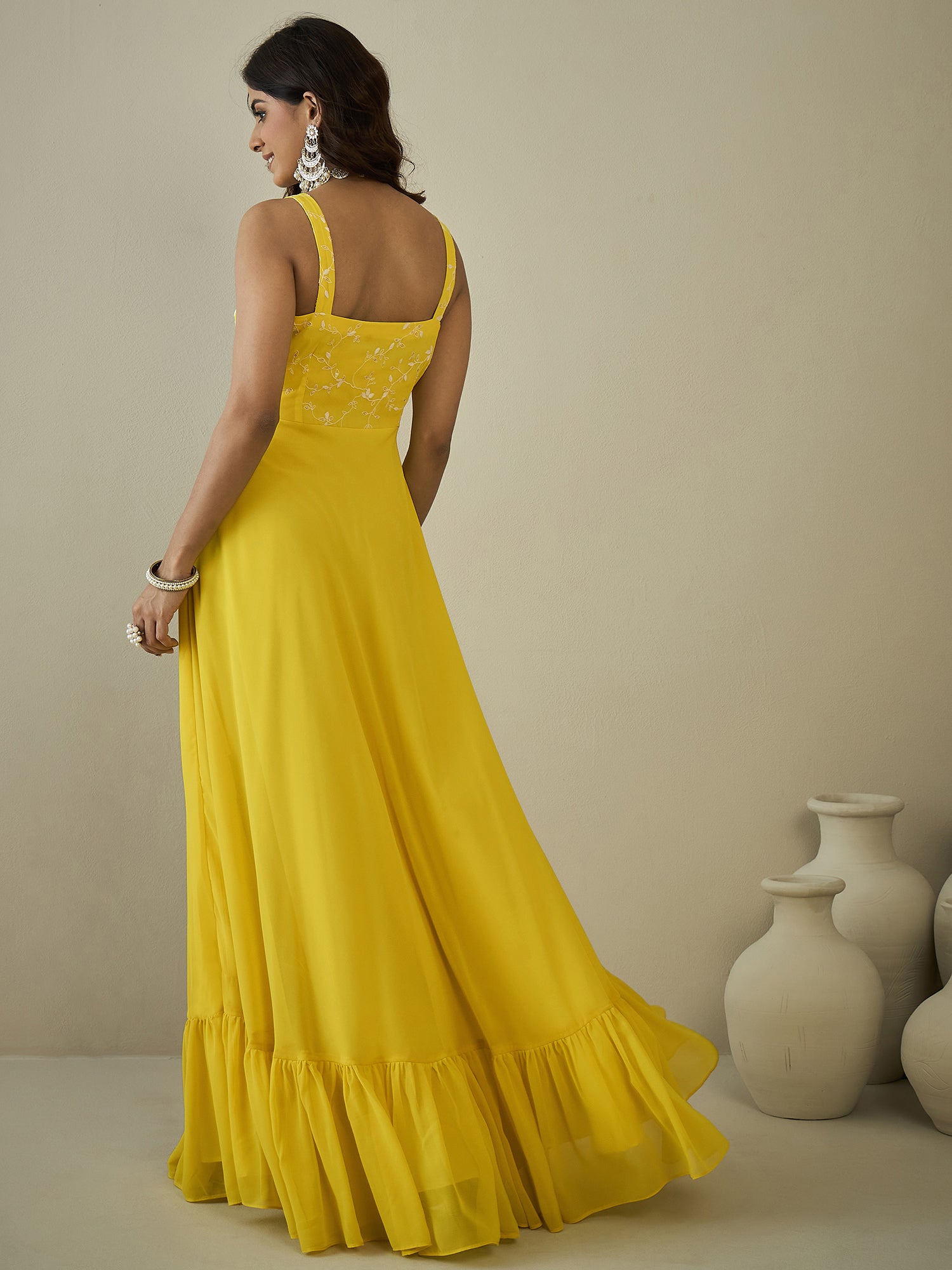 Expertly crafted, this embroidered maxi ethnic dress is a must-have for any fashion enthusiast. Featuring stunning yellow fabric with intricate embroidery, a flattering fit and flare shape, and comfortable shoulder straps, this dress is perfect for any occasion. The three-quarter length sleeves and flared hem add a touch of elegance, while the slip-on closure makes it easy to wear. Made from high-quality georgette material, this dress is both luxurious and easy to care for with dry cleaning. Elevate your wardrobe with this timeless piece.