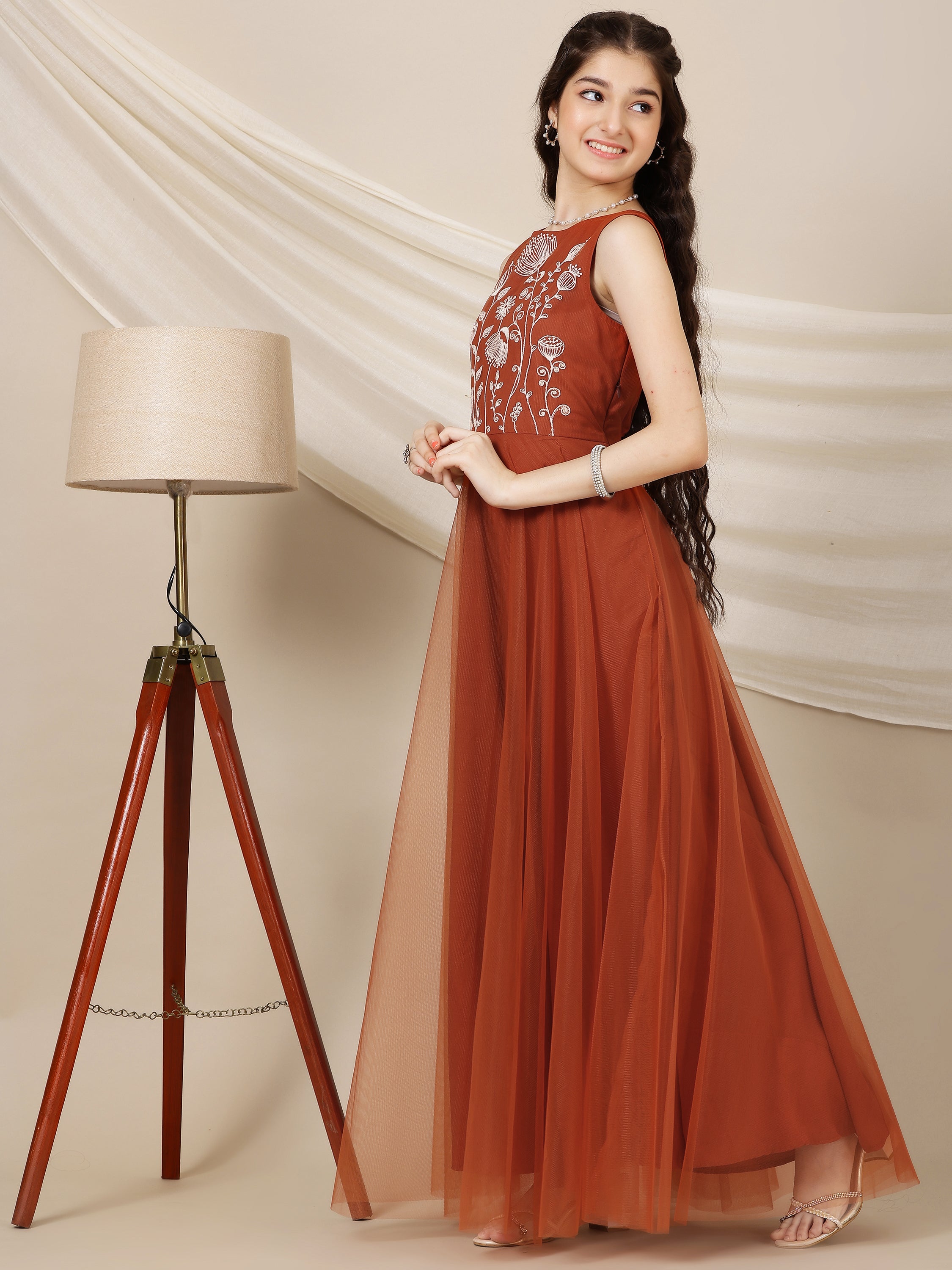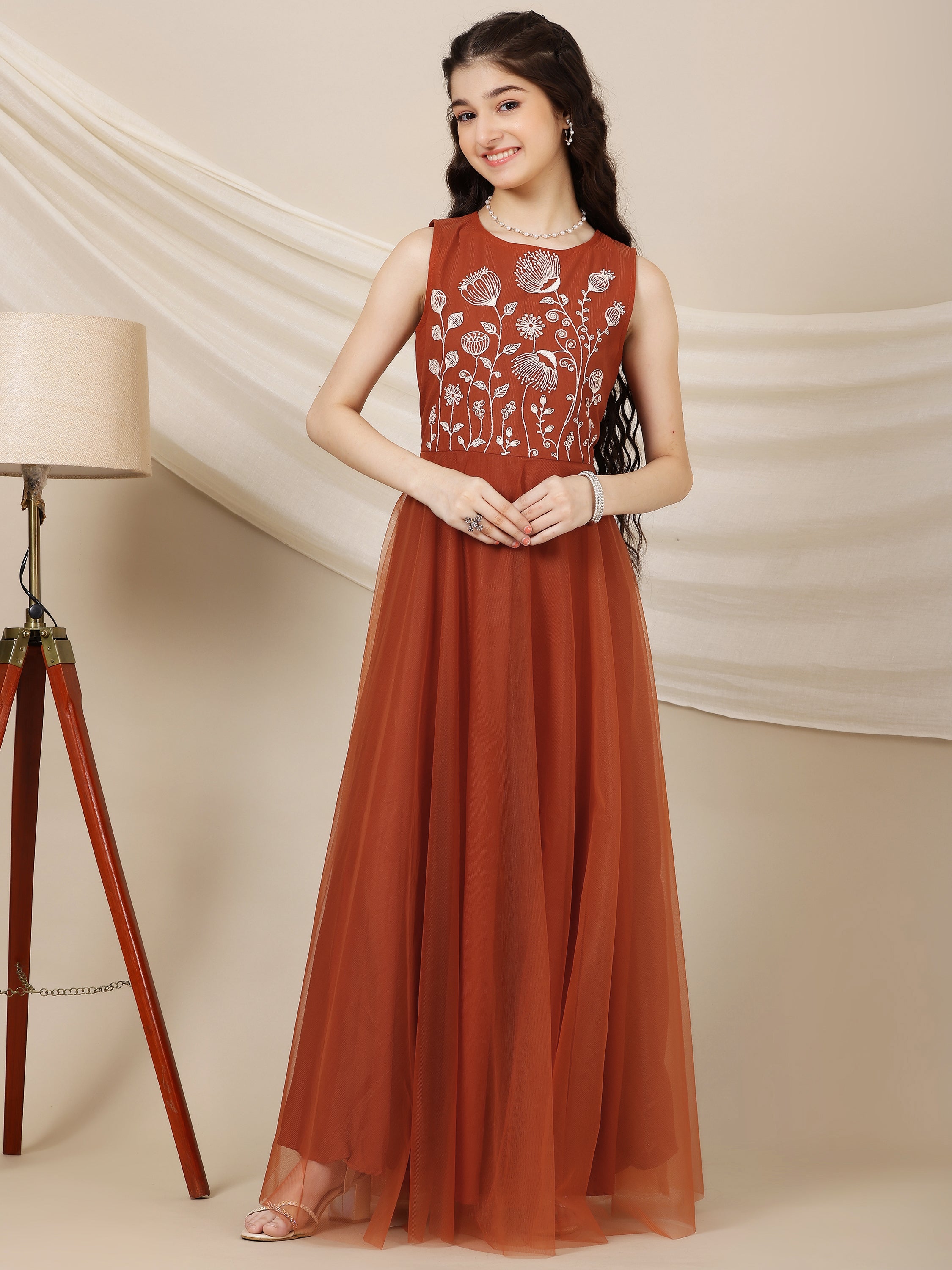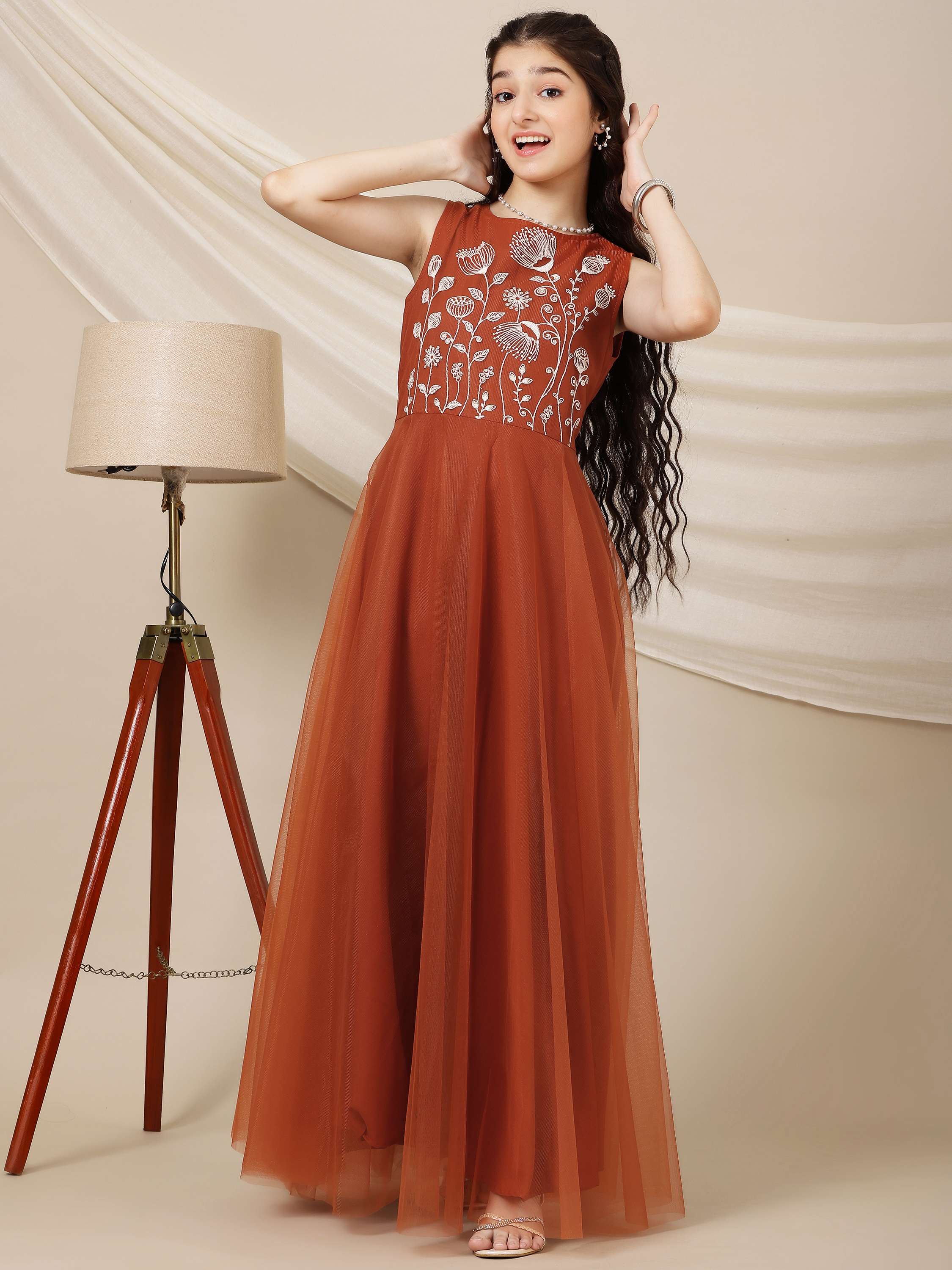 Introducing our Rust Embroidered Maxi Ethnic Dress, perfect for any occasion. The round neck and sleeveless design adds a touch of elegance, while the flared hem provides a comfortable fit. Made with slip-on closure for easy wear and beautifully embroidered for a unique touch. Expertly crafted for a stunning look.