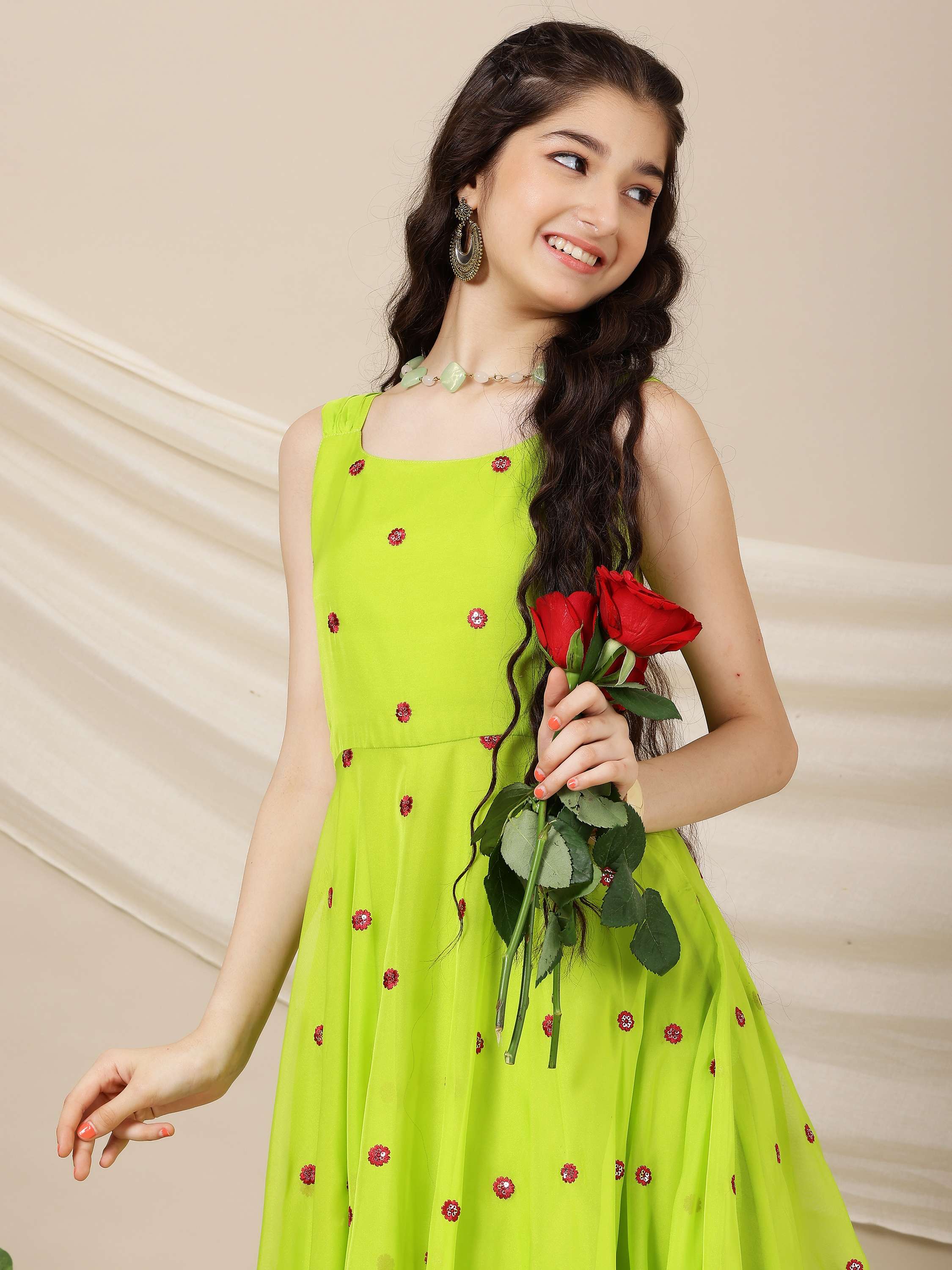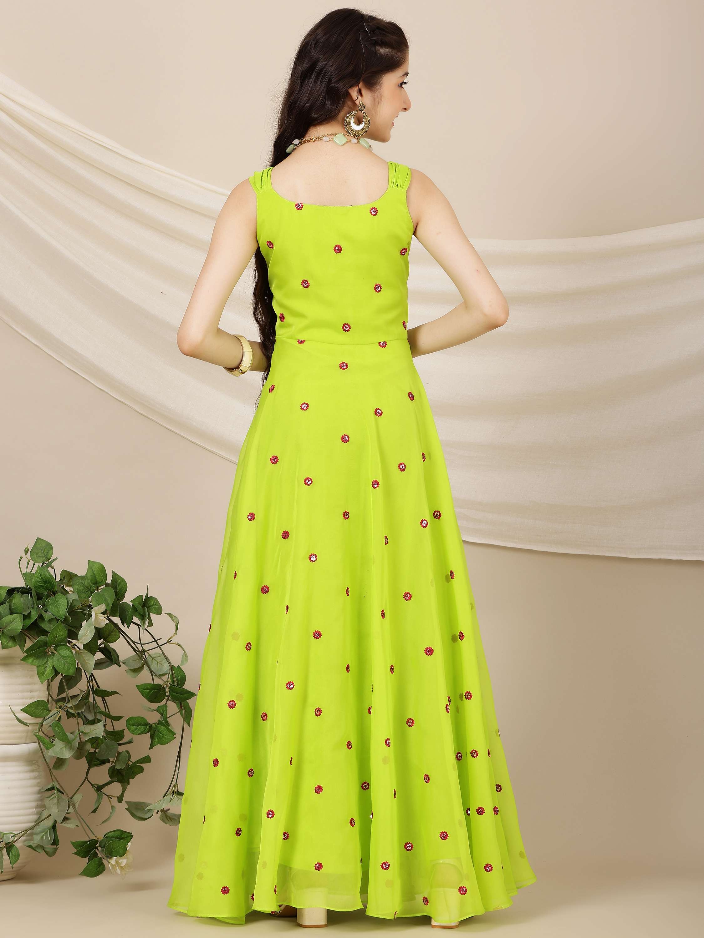 Made with stunning lime green fabric, this embroidered maxi dress is the perfect addition to your wardrobe. With its flared hem and slip-on closure, the dress is both comfortable and stylish. The maxi shape and shoulder straps make it ideal for any occasion, and the sleeveless design adds a touch of sophistication. Own the room in this ethnic dress.