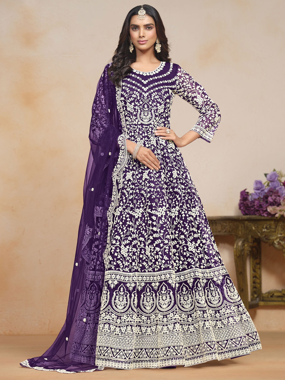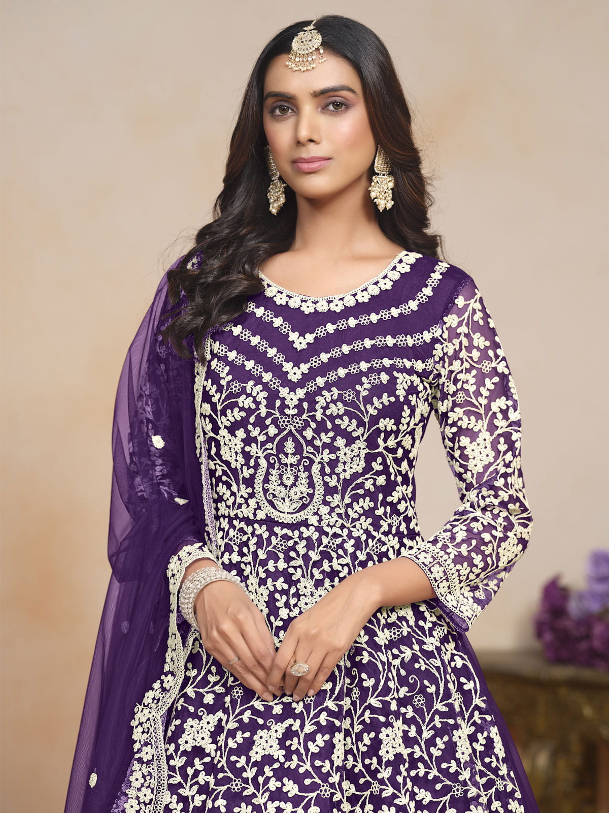 This purple Embroidered Net Abaya Style Suit is a semi-stitched ensemble that exudes elegance and class. With its intricate Resham, Dori and Sequins work, this suit is perfect for any occasion. The Poly Shantoon lining and churidar add to its comfort and style. Available with a matching Net Dupatta, this outfit has a Kameez and Bottom length of 52 and 46 inches respectively.