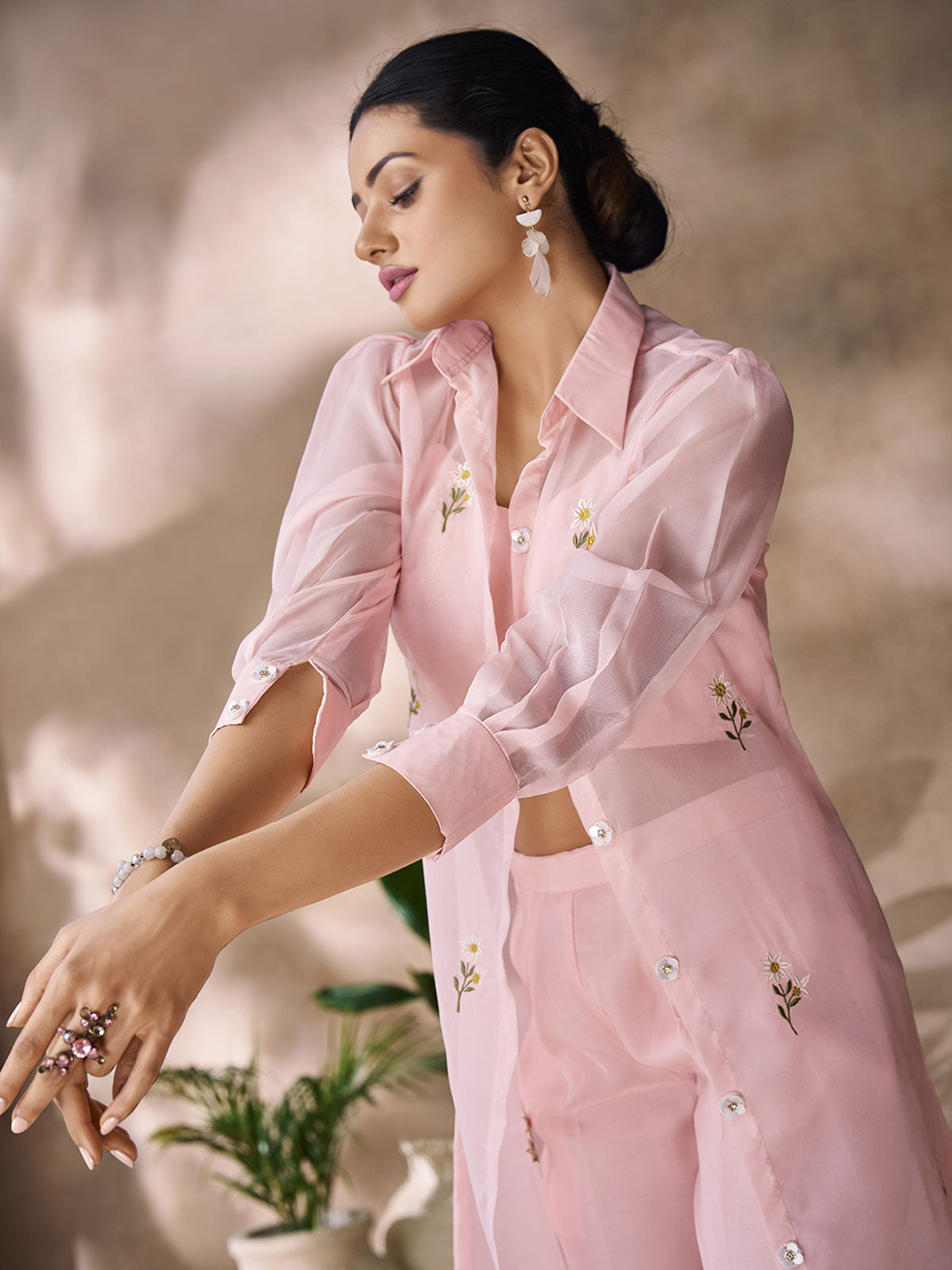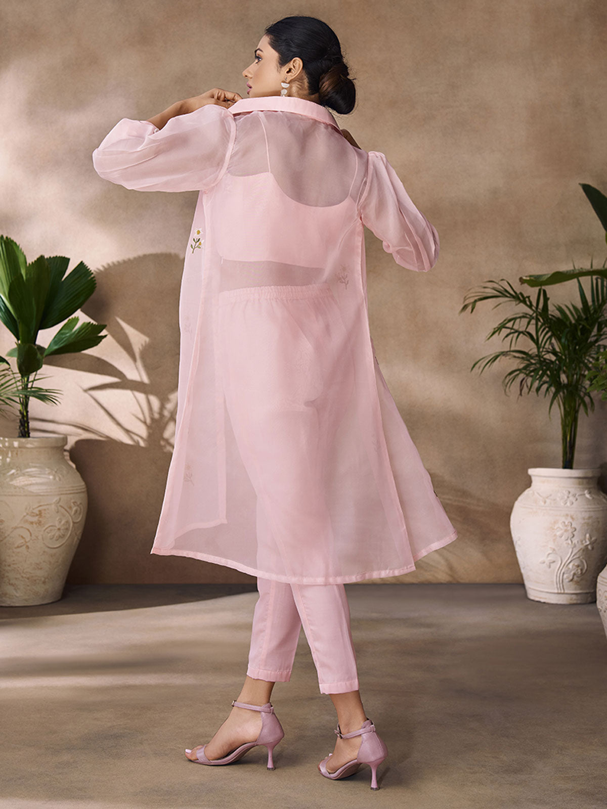 Elevate your style with our gorgeous pink organza party wear kurti. The delicate ethnic embroidery adds a touch of elegance to your look. Its superb design and high-quality fabric ensure you'll look both stylish and graceful. (Color, fabric & work may vary. Model images for representation only.)