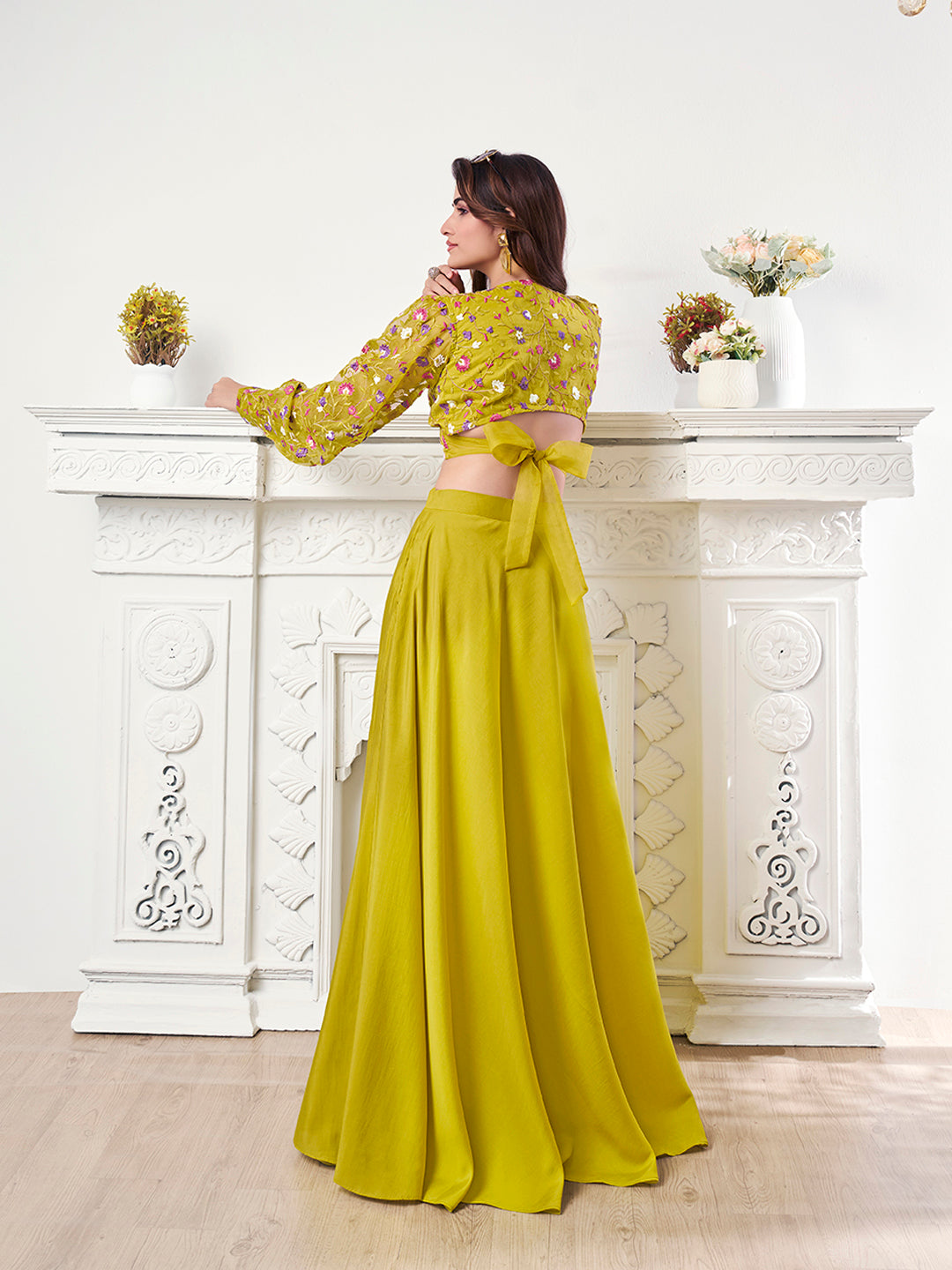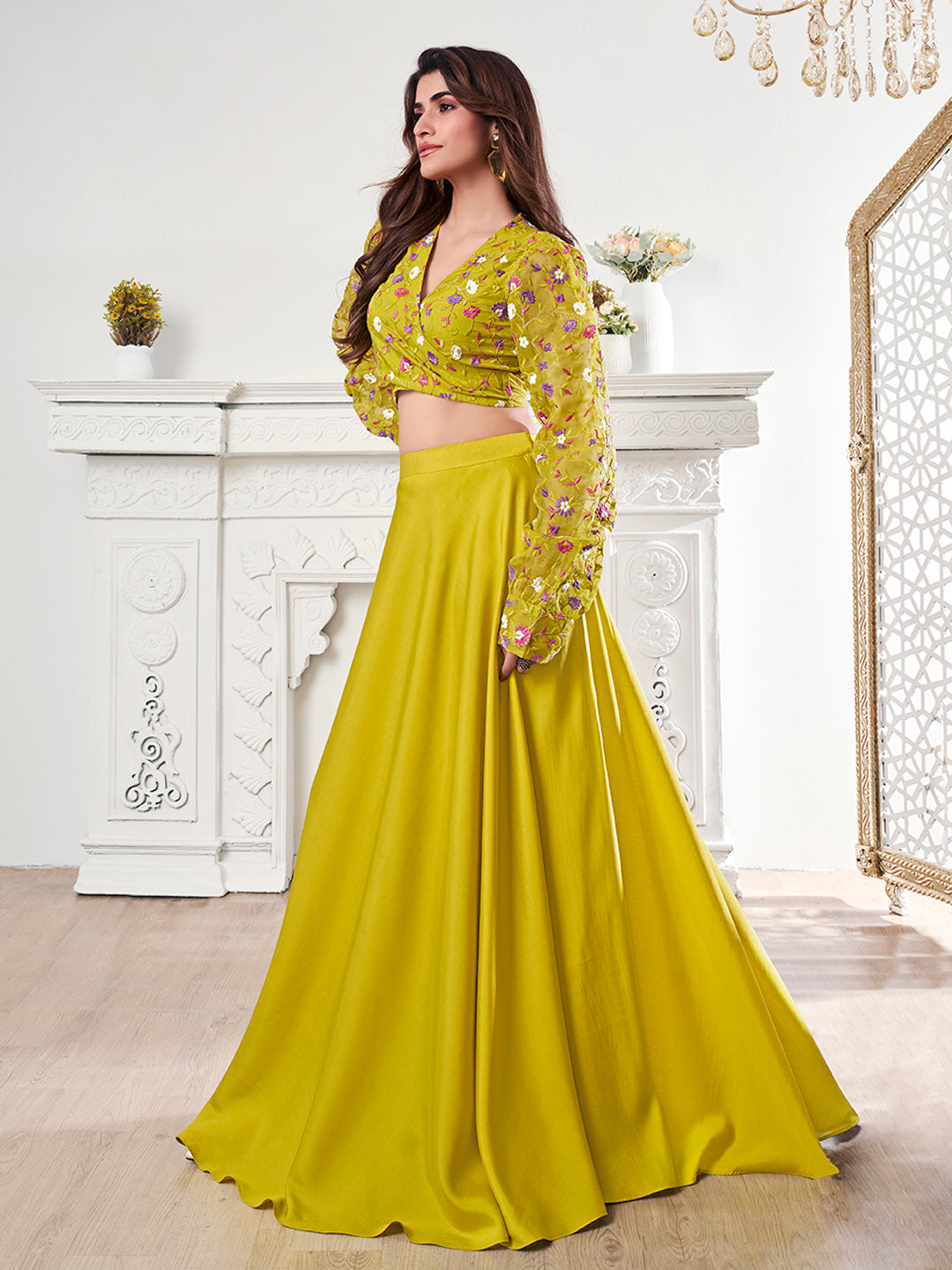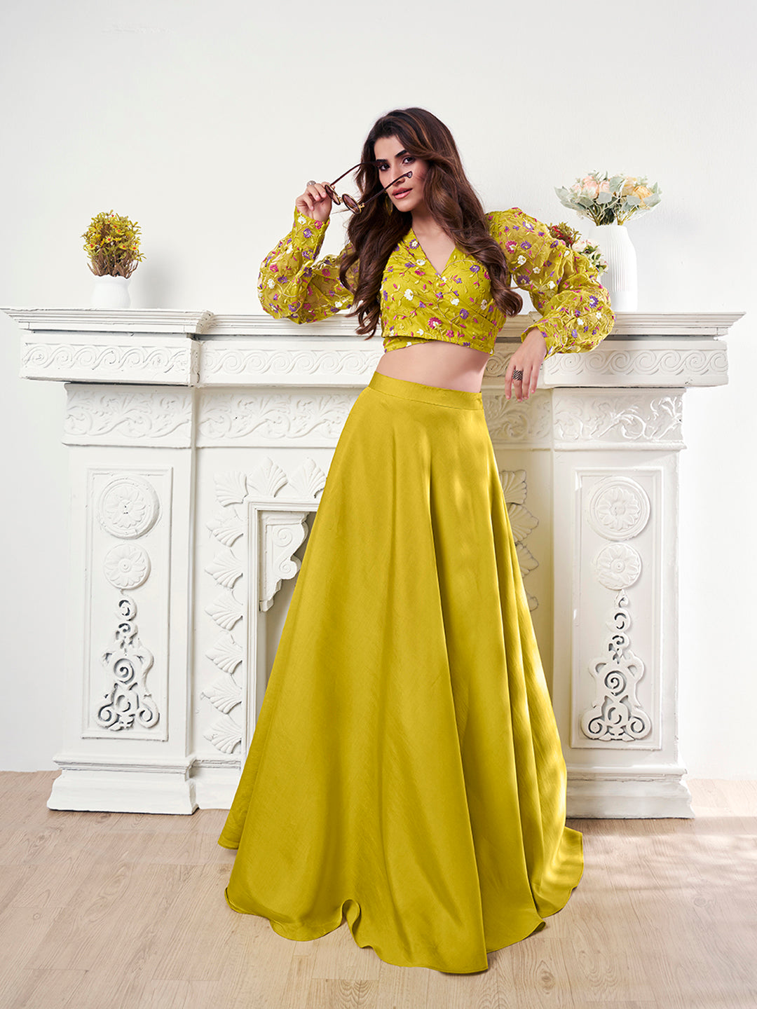 Introducing our beautifully Embroidered Organza Top & Flared Maxi Skirt Co-Ord Set. This set includes a yellow, white, and violet floral embroidered crop top with a V-neck and full balloon sleeves, as well as a yellow solid maxi skirt with a flattering flared hem. Made with high-quality materials such as organza, crepe, and viscose silk, this co-ords set is both stylish and easy to care for with dry cleaning. Elevate your wardrobe with this must-have set.