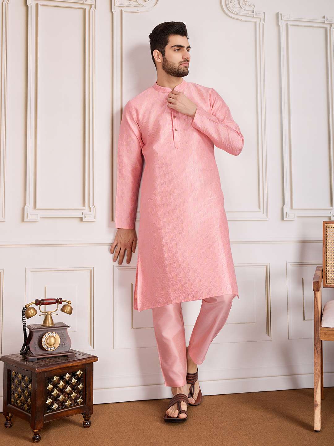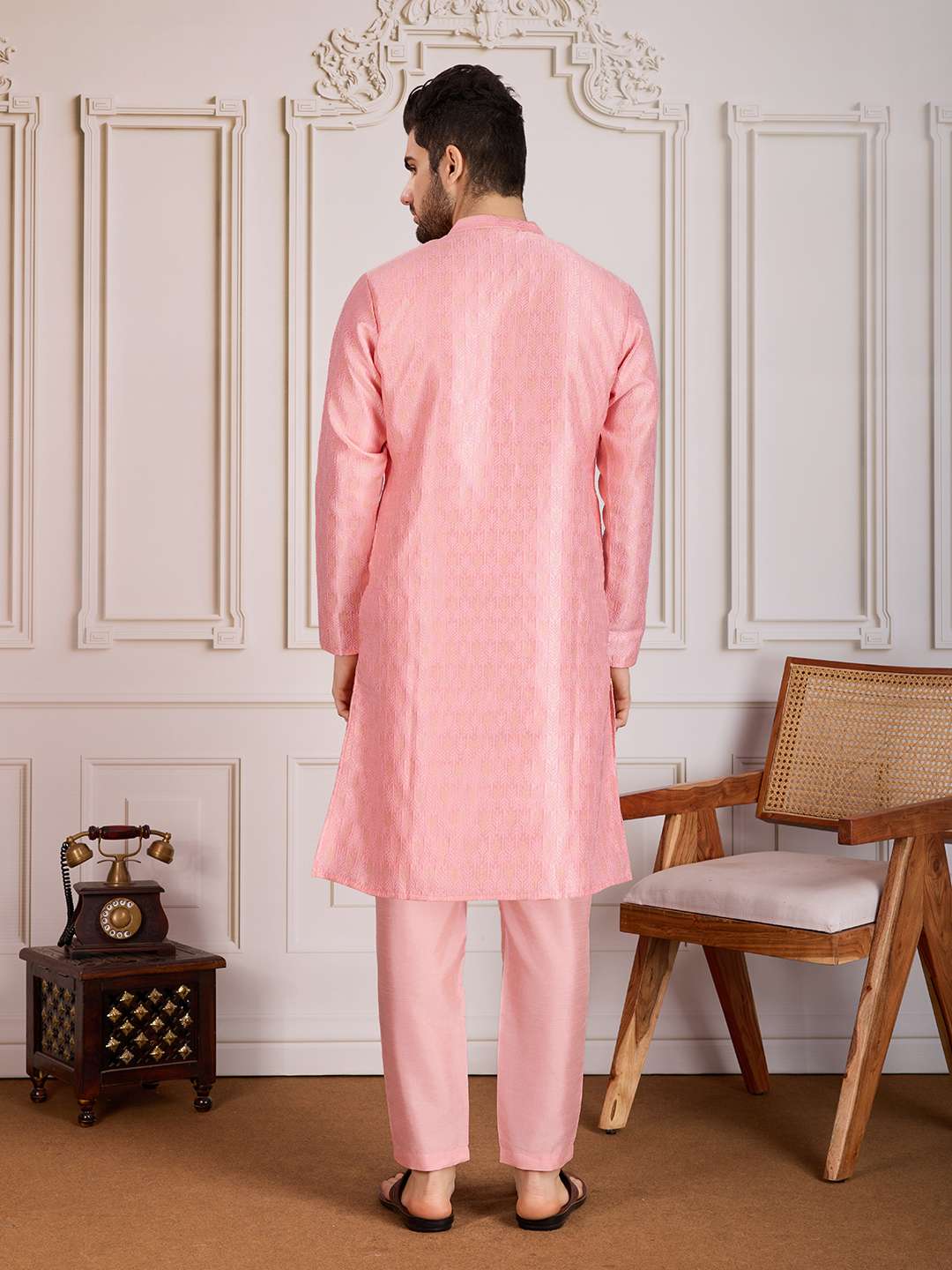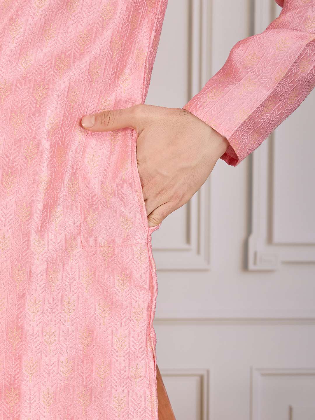 Elevate your style with our Embroidered Straight Kurta & Trousers. This set features a gorgeous peach kurta with intricate embroidery, mandarin collar, and long regular sleeves. The knee-length kurta is made from a machine-woven silk blend and has side slits for added comfort. The peach solid trousers have a slip-on closure for easy wear. Perfect for any occasion, this set will make you stand out in a crowd.