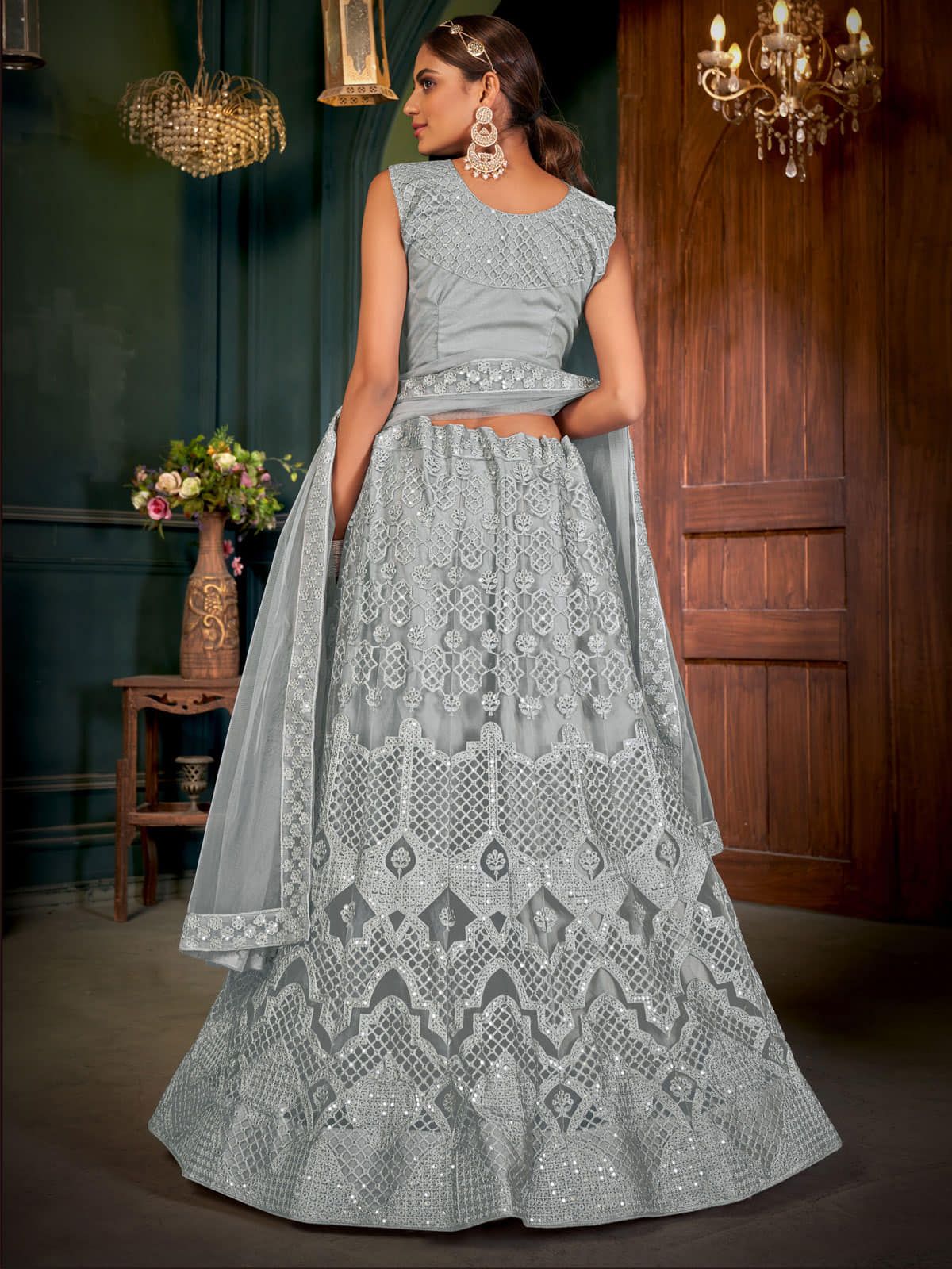 Grey embroidered lehenga choli with dupatta, thread work