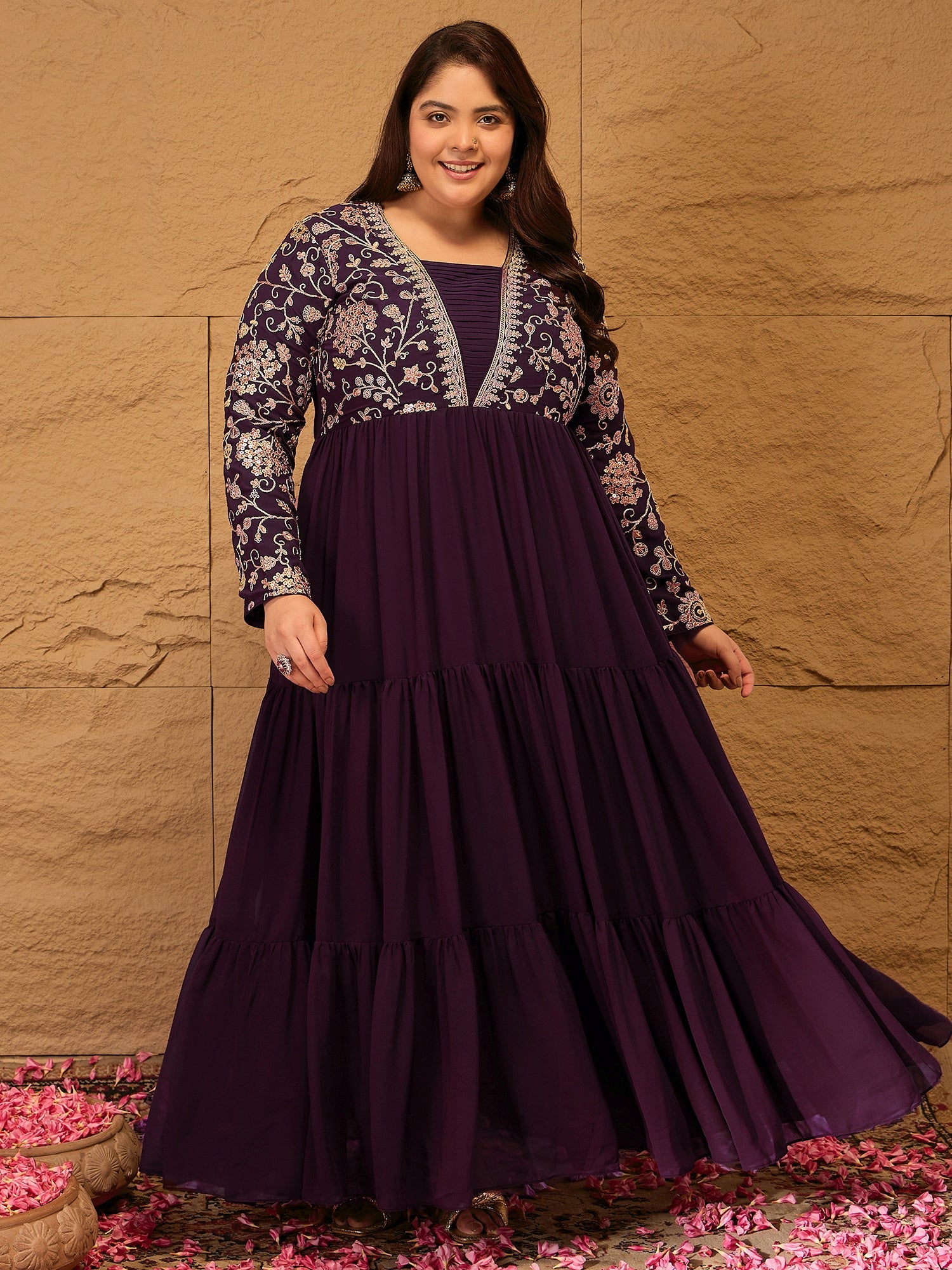 Elevate your style with our Embroidered Tiered Fit and Flare Ethnic Dress. Crafted with intricate purple embroidery and a flattering tiered A-line shape, this dress is perfect for any occasion. The V-neck and long regular sleeves add a touch of elegance while the flared hem adds a playful flair.