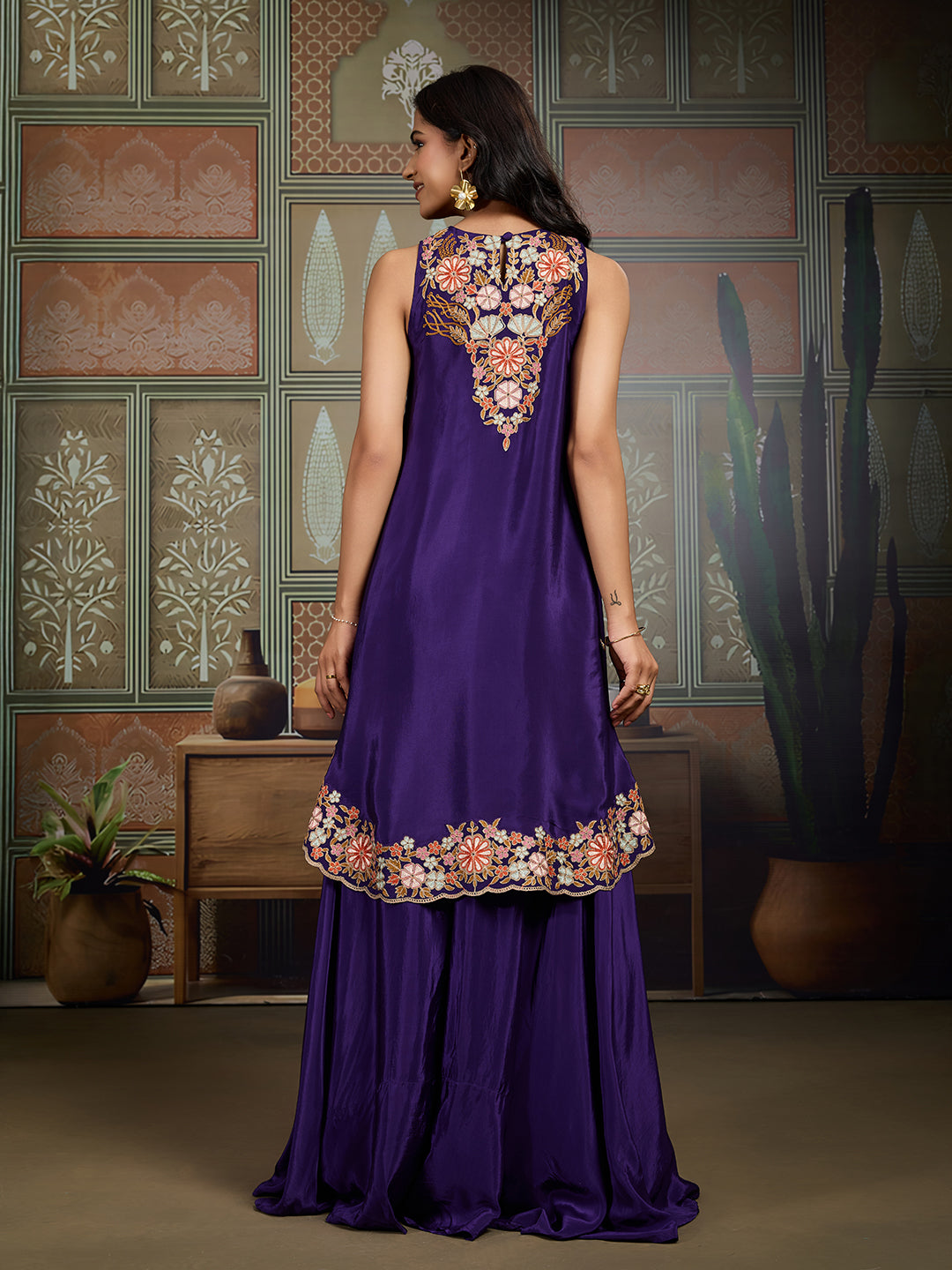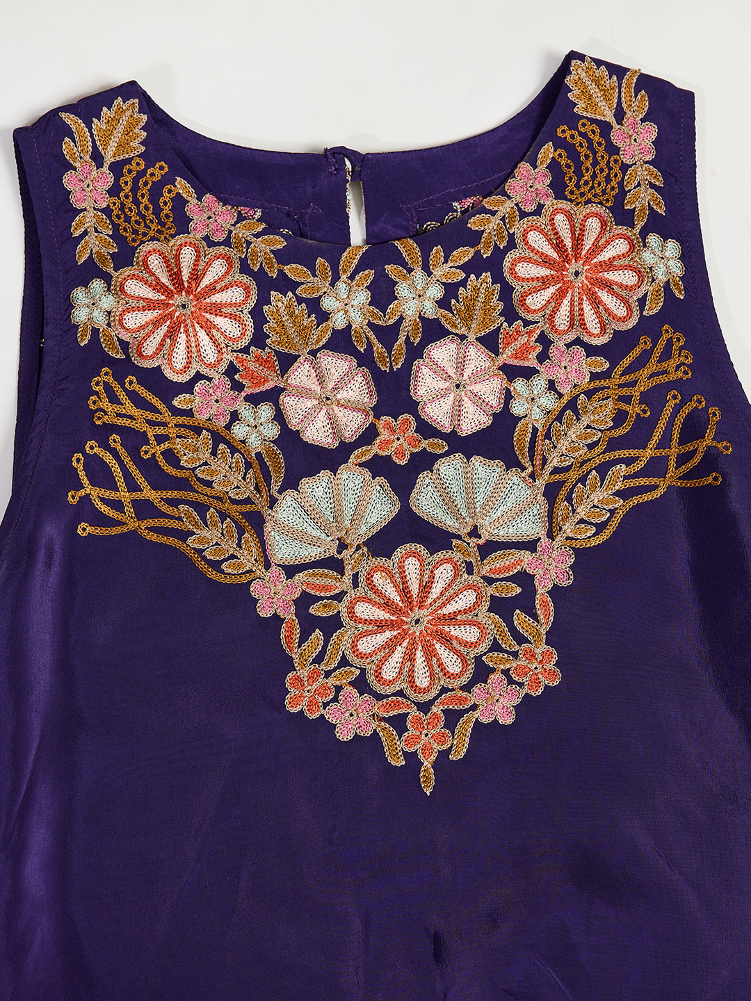 Purple embroidered top has a round collar neck and sleeveless, secured with slip on closure