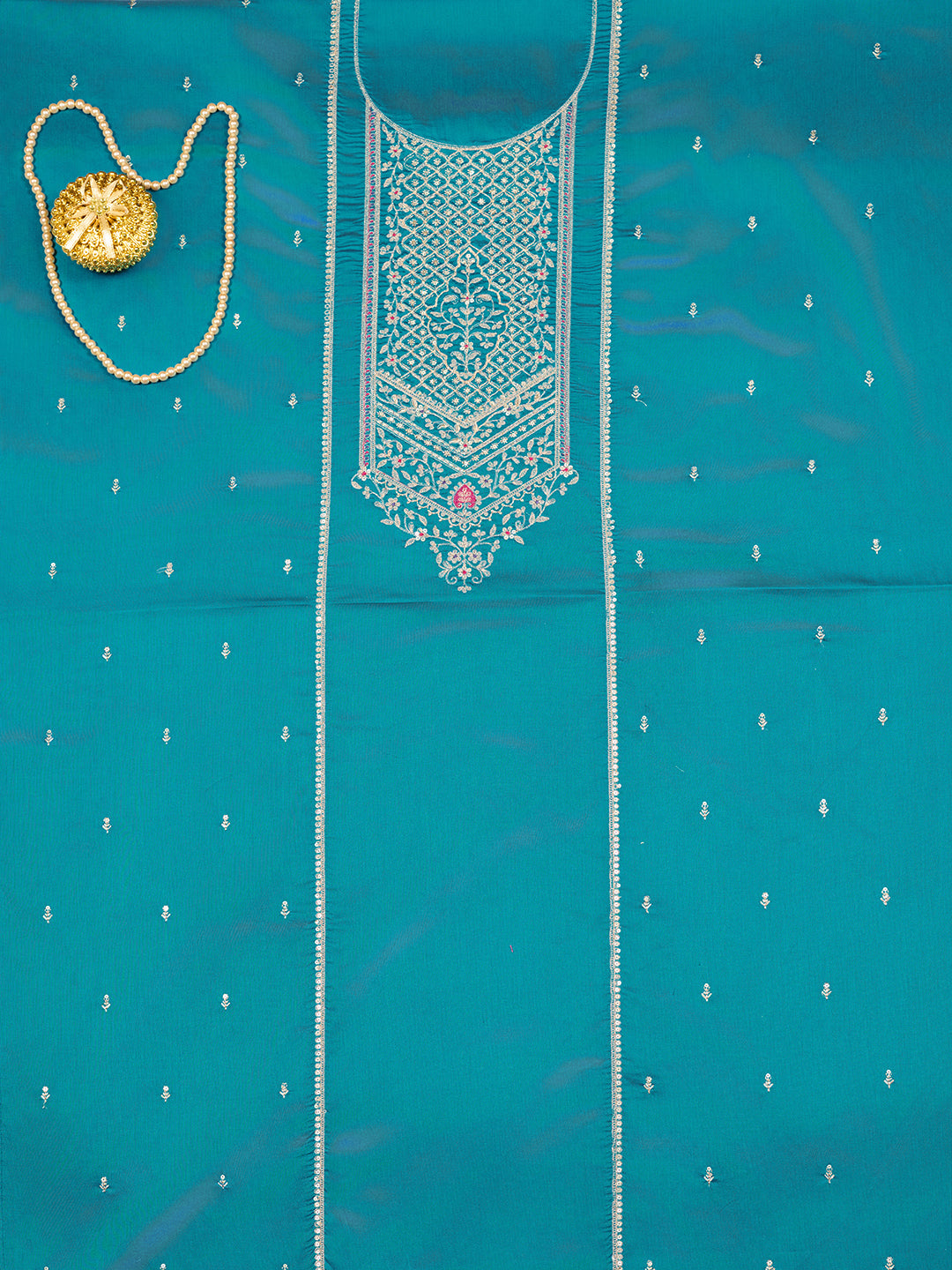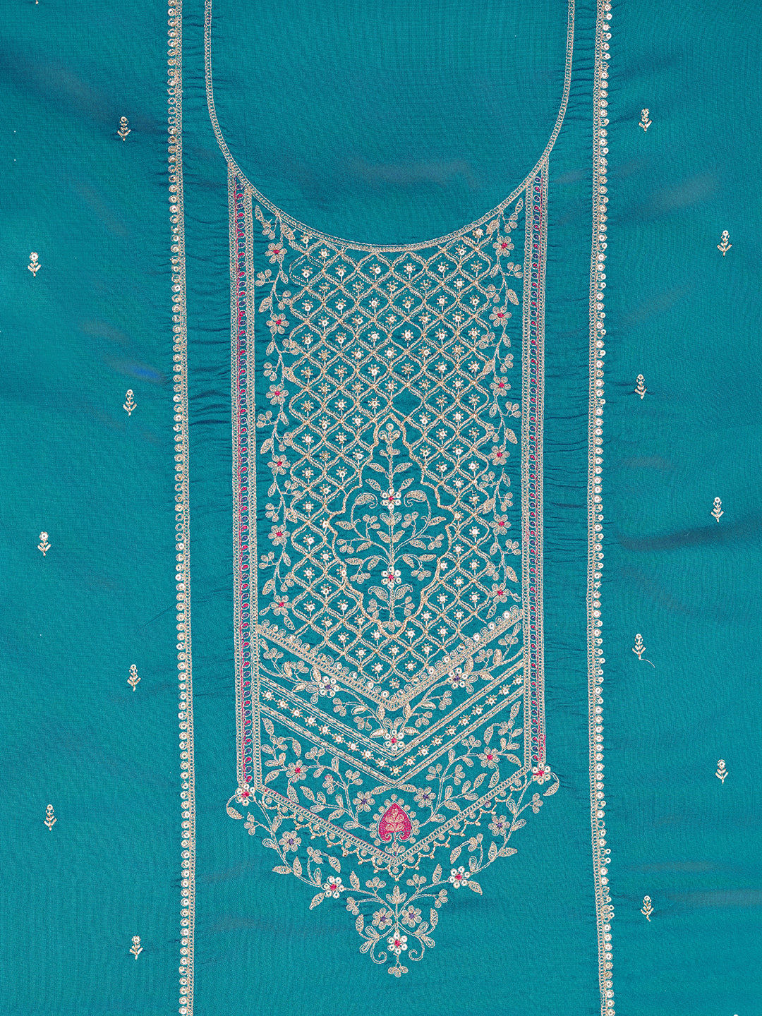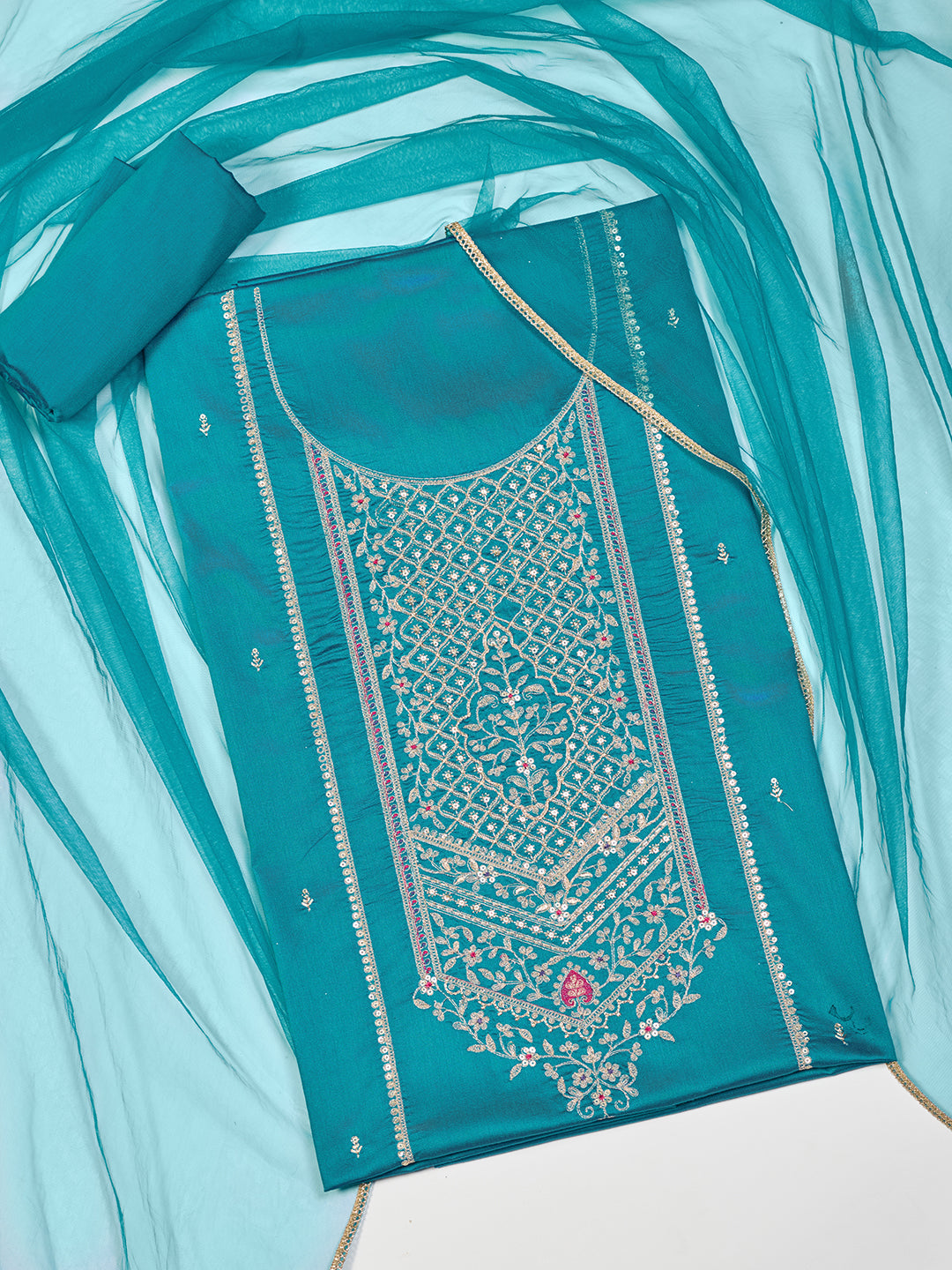 This turquoise blue embroidered unstitched dress material is made of high-quality viscose silk and net, perfect for formal and special occasions. The kurta fabric has a big width of 56" inches, while the bottom fabric has a solid pattern. The dupatta has a beautiful taping border and a width of 42", adding a touch of elegance to the overall look. Dry clean recommended for best care. (40 words)