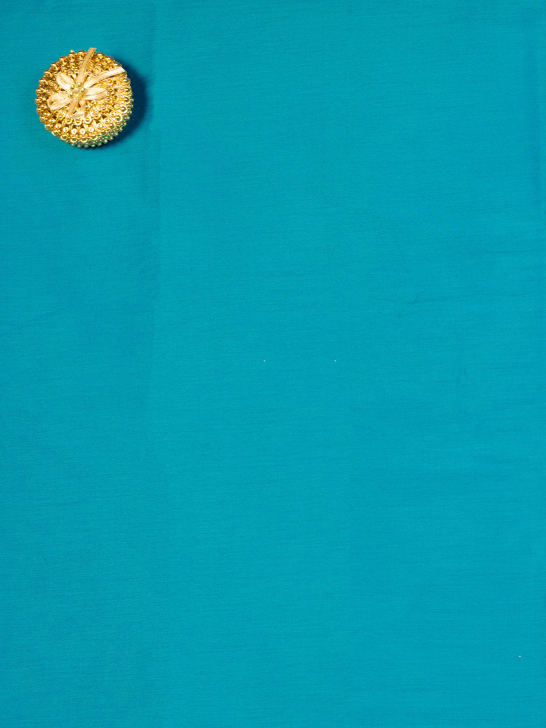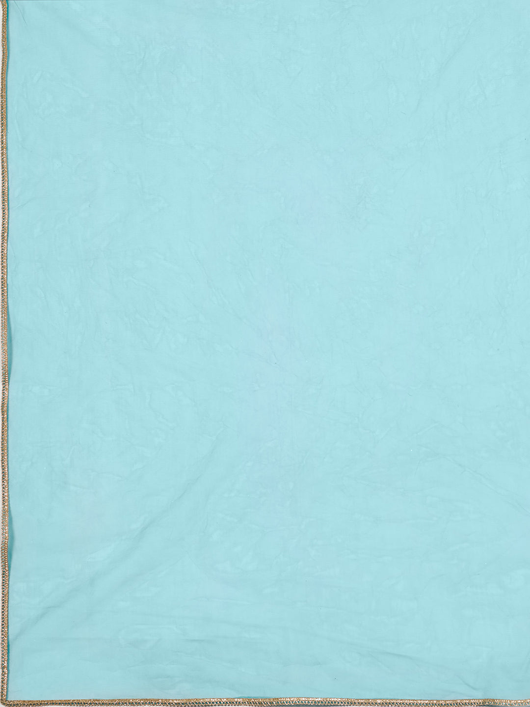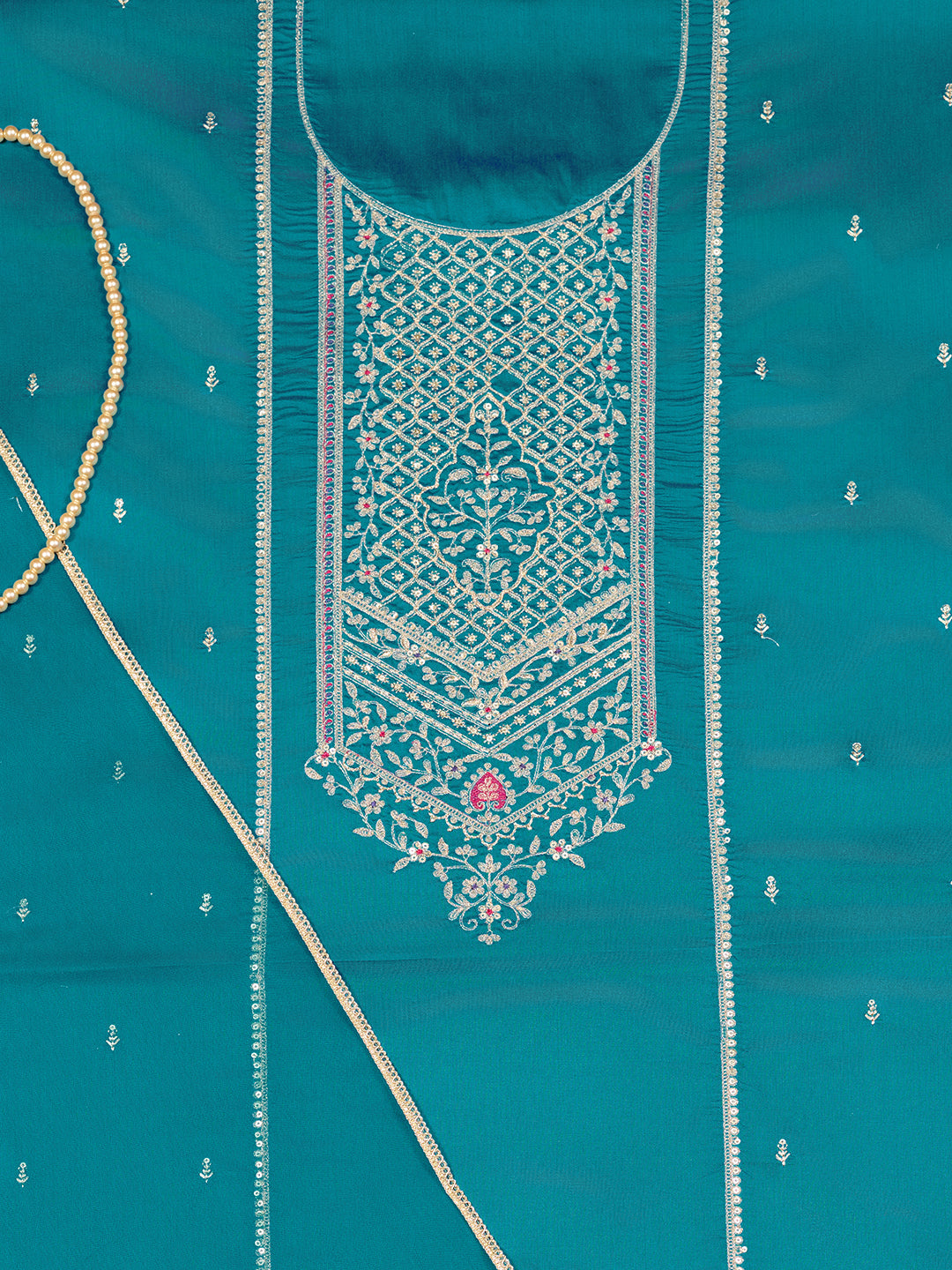 This turquoise blue embroidered unstitched dress material is made of high-quality viscose silk and net, perfect for formal and special occasions. The kurta fabric has a big width of 56" inches, while the bottom fabric has a solid pattern. The dupatta has a beautiful taping border and a width of 42", adding a touch of elegance to the overall look. Dry clean recommended for best care. (40 words)