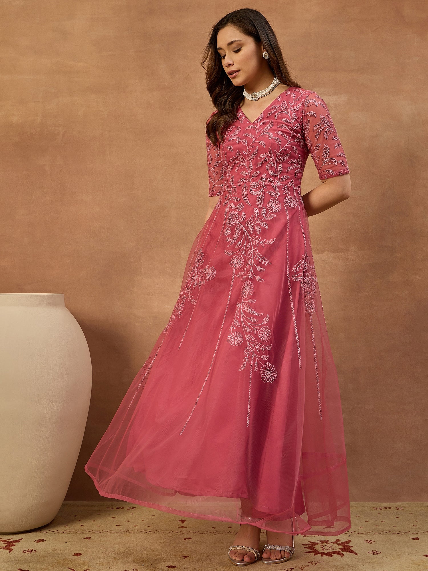 Embrace timeless elegance with this pink and white ethnic gown dress, perfect for celebrations and special occasions. Featuring delicate floral embroidery throughout, the dress showcases a flattering V-neckline and short sleeves for comfortable wear. The gown silhouette flows beautifully with a flared hem that adds graceful movement. Simply slip it on for effortless style. The model, standing 5'8", wears size S. Crafted from polyester for durability and easy maintenance. Dry clean recommended to preserve the intricate embroidery and fabric quality.