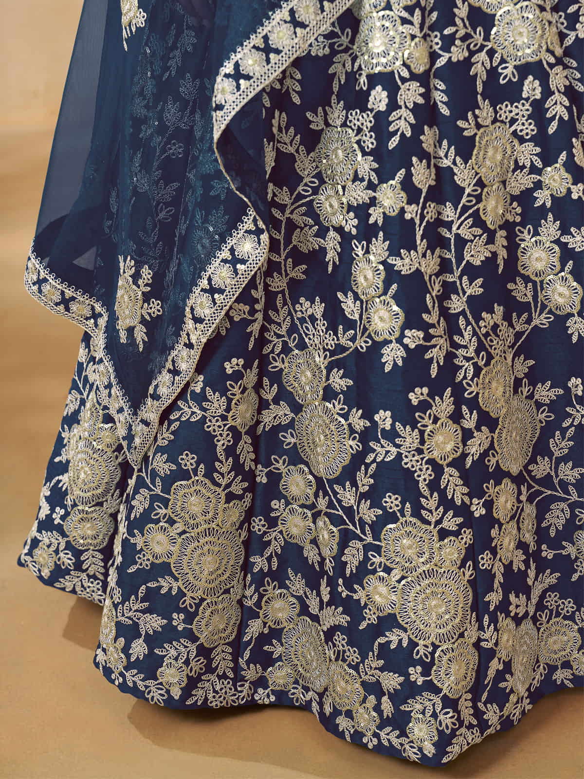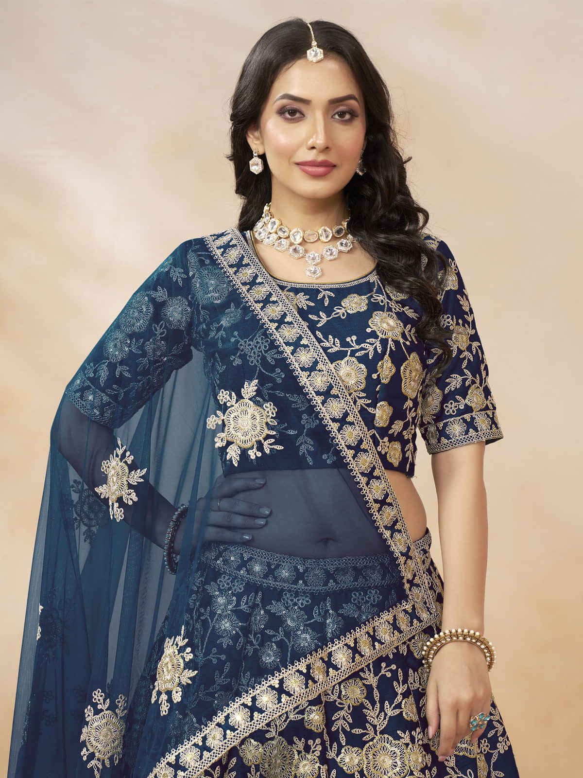 This enchanting blue embroidered silk lehenga choli is designed for weddings, receptions, and festive occasions. Featuring intricate sequin and embroidery work, it offers a sophisticated and graceful look. The semi-stitched lehenga and unstitched choli, crafted from luxurious silk, can be tailored up to size 42 for a perfect fit that flatters your silhouette. A matching blue net dupatta completes the ensemble, adding elegance and charm. Combining traditional craftsmanship with modern style, this set ensures you make a lasting impression at any special event.