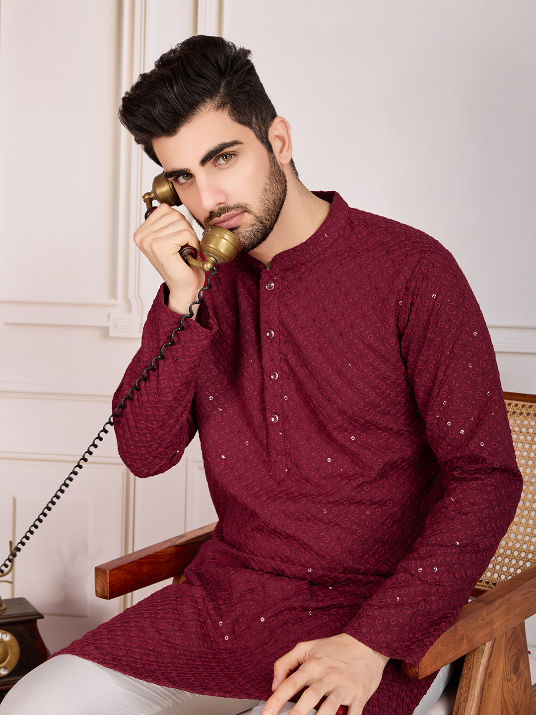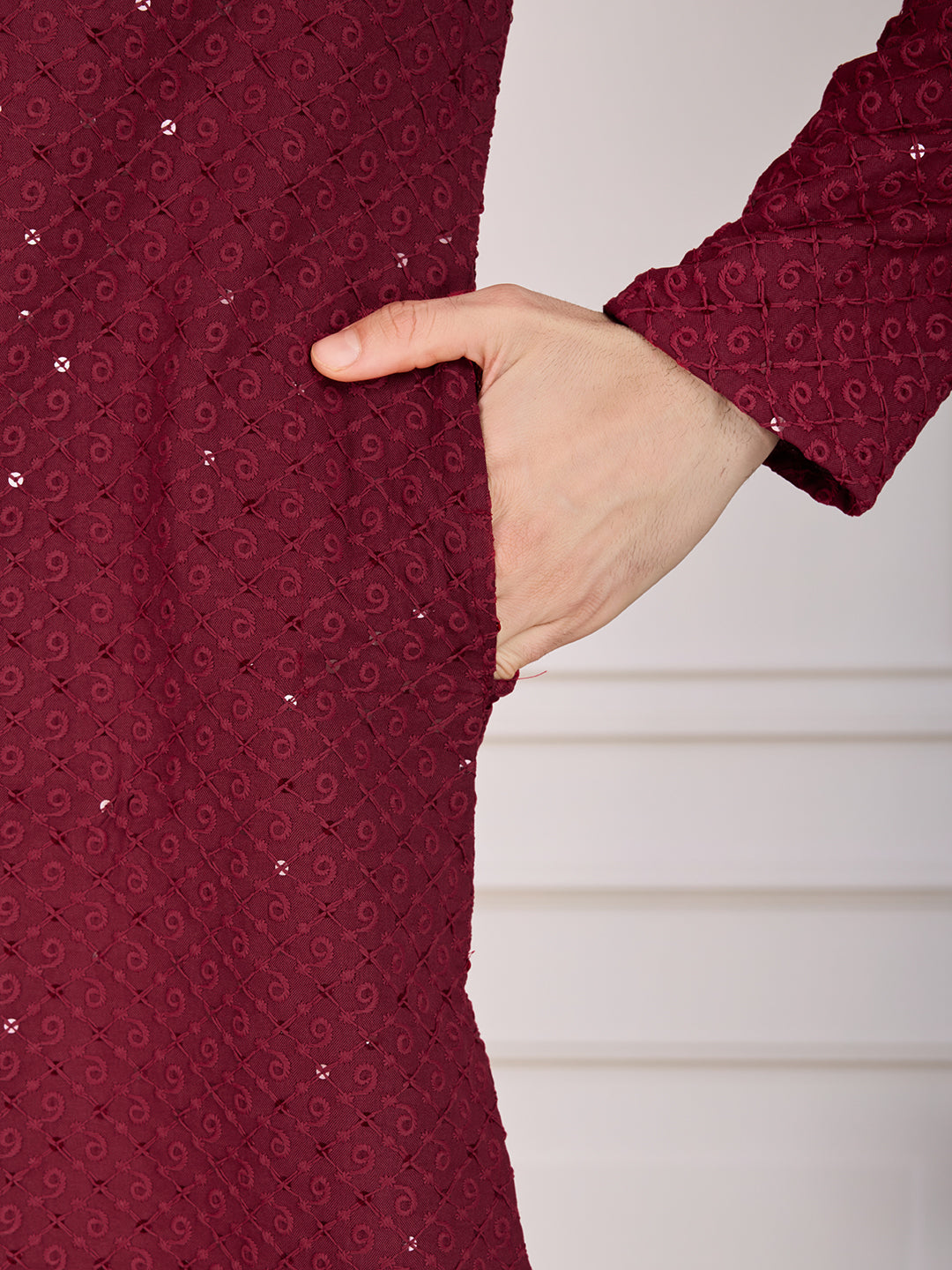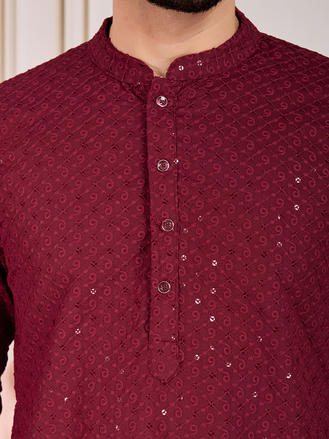 This Ethnic Chikankari Embroidered Straight Kurta Set features a maroon kurta with chikankari embroidery, a mandarin collar neck, and long regular sleeves for a classic and elegant look. The regular viscose rayon material is machine woven for durability and comfort. The set also includes white solid trousers with a zip closure for a complete and polished outfit. Achieve a chic and timeless style with this kurta set.