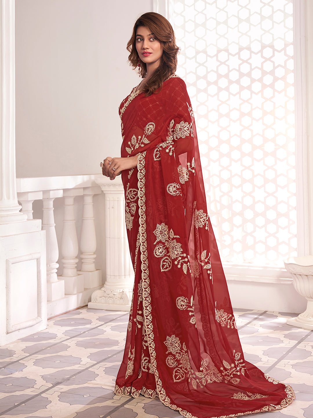 This maroon and gold-toned saree features an intricate Ethnic Motif embroidery with a complementary embroidered border. Made from high-quality Organza material, it offers a comfortable fit and is easy to maintain with dry cleaning. The unstitched blouse piece allows for a personalized touch. Length: 5.5m + 0.8m blouse piece, Width: 1.06m (approx.).