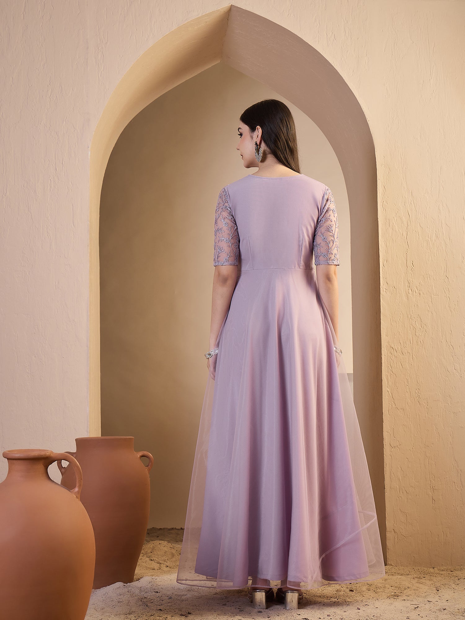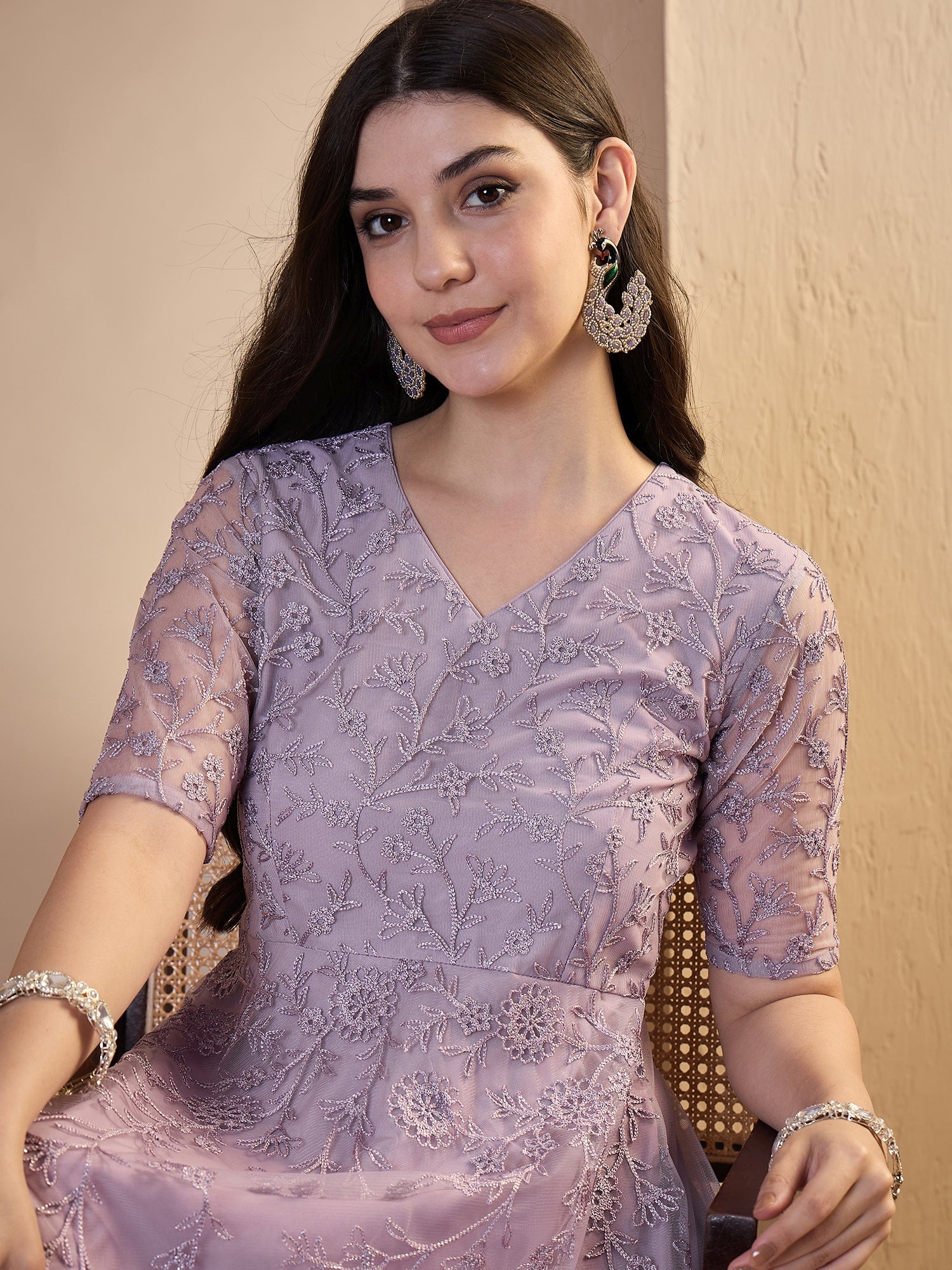 Embrace timeless elegance with this lavender ethnic dress, expertly crafted with intricate floral embroidery that celebrates traditional artistry. The gown-shaped silhouette features a flattering V-neckline and long sleeves for refined sophistication, while the gracefully flared hem adds movement and dimension. A convenient zip closure ensures effortless wear. Perfect for festive occasions, cultural celebrations, or anyone seeking a distinctive piece that blends heritage craftsmanship with contemporary style.