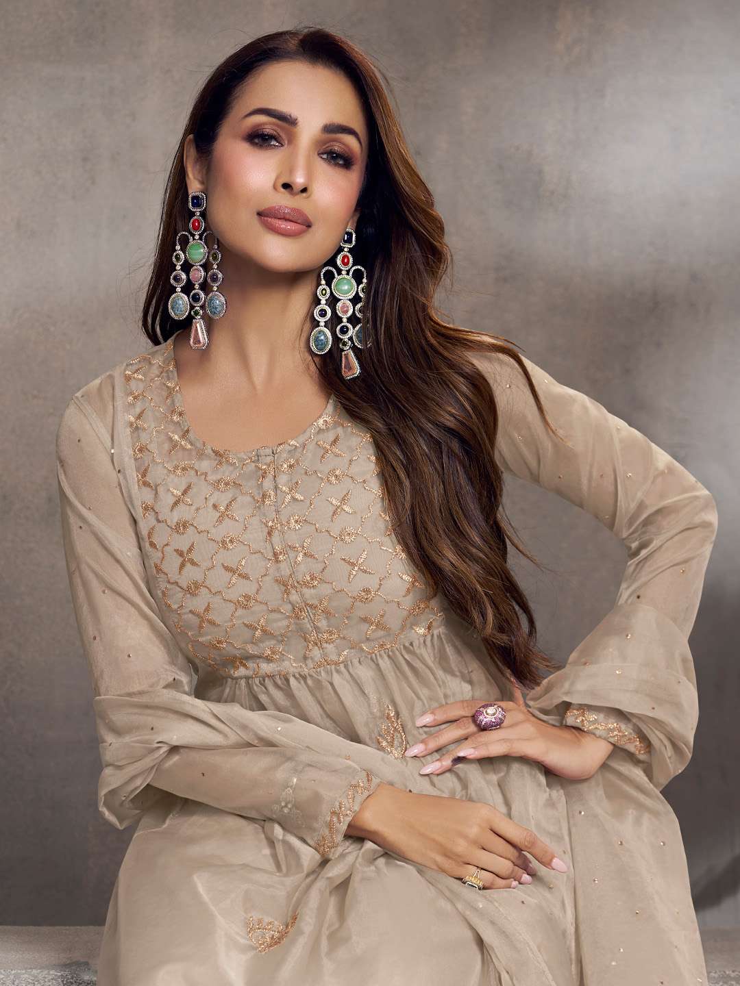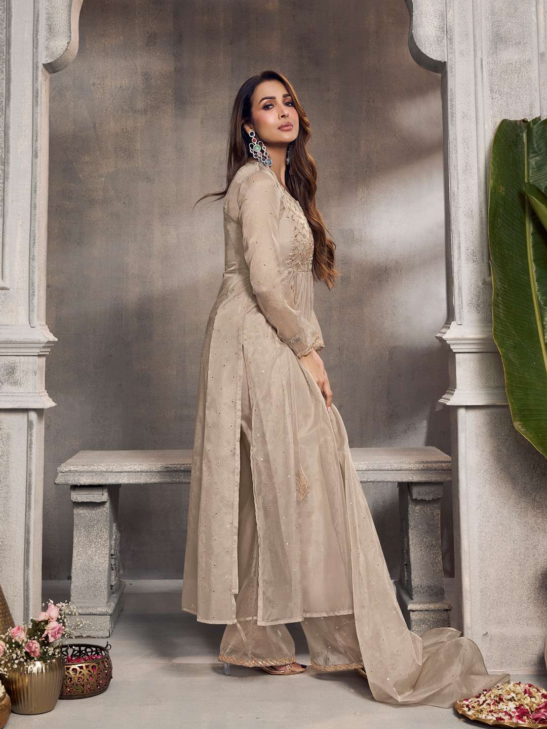 Malaika Arora Ethnic Motifs Embroidered Pleated Zari Organza Kurta With Palazzos & Dupatta