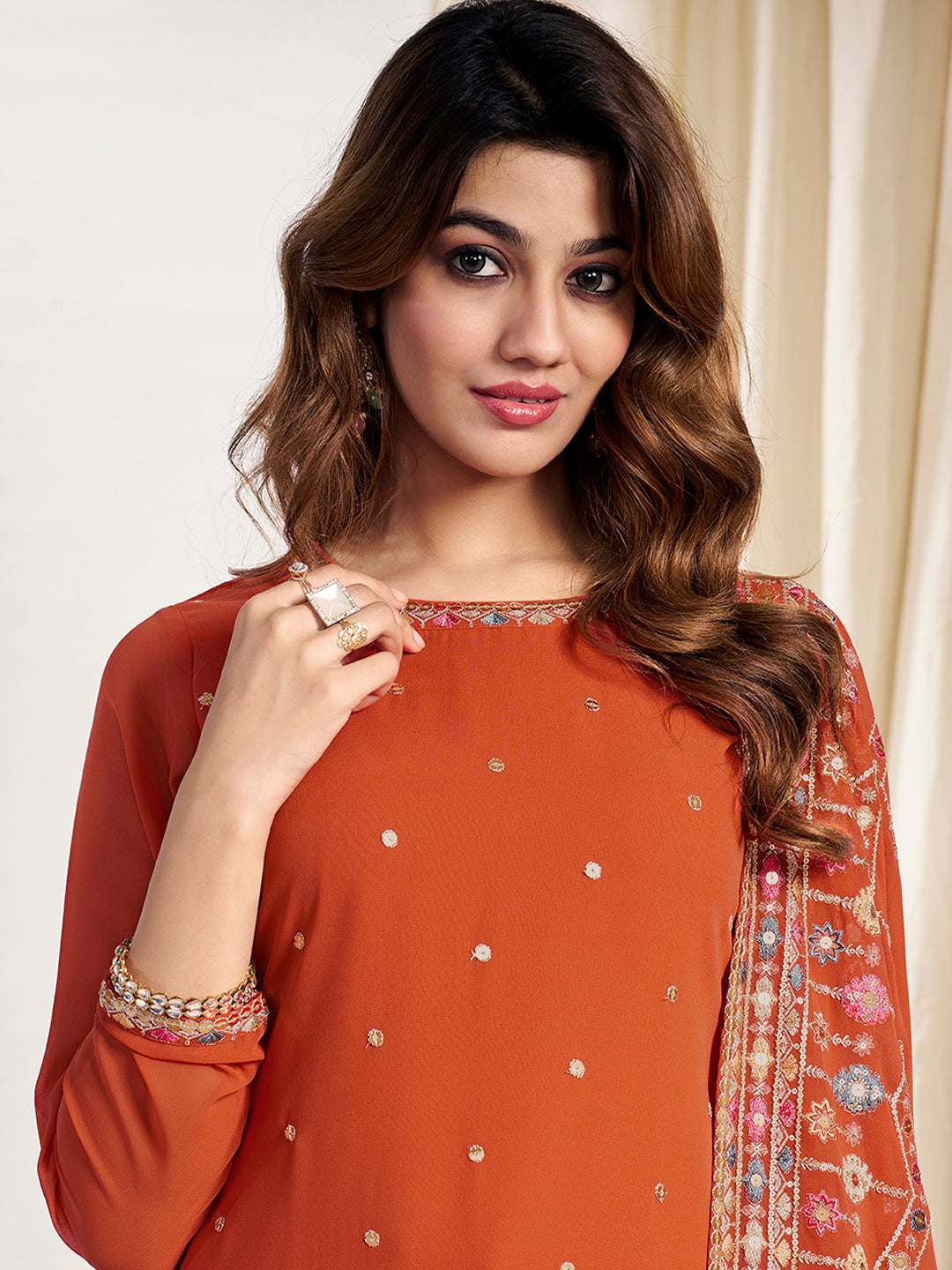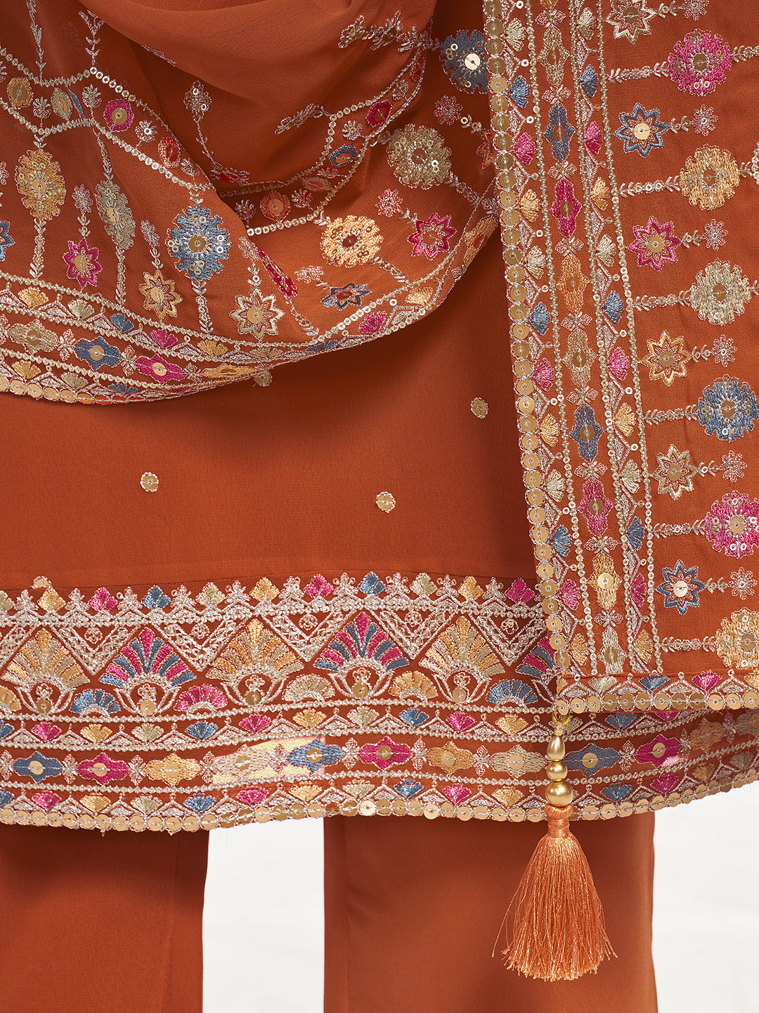 This rust-colored, embroidered kurta set boasts a traditional design with ethnic motifs and delicate sequin detailing. Made of georgette machine weave fabric, the kurta features a straight shape, round neck, and long regular sleeves. The solid trouser has a partially elasticated waistband for a comfortable fit, and the embroidered dupatta adds an elegant touch with tassel borders. Perfect for any occasion, this set will elevate your ethnic wardrobe.