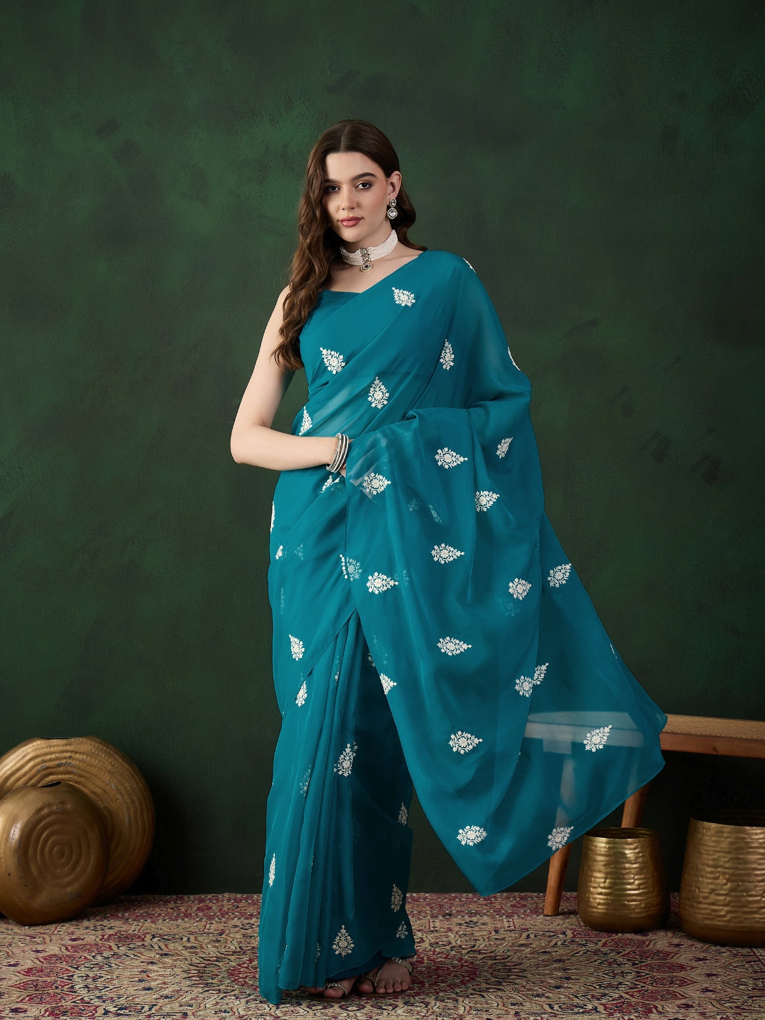 This exquisite Ethnic Motifs Embroidered Saree in Turquoise Blue boasts intricate embroidery and elegant ethnic motifs, without a border. The 5.50 m saree comes with a 1 m unstitched blouse piece, perfect for customization. Please note that the blouse shown on the model is for display purposes only, the actual blouse piece can be viewed in the product image. Elevate your style with this stunning saree.