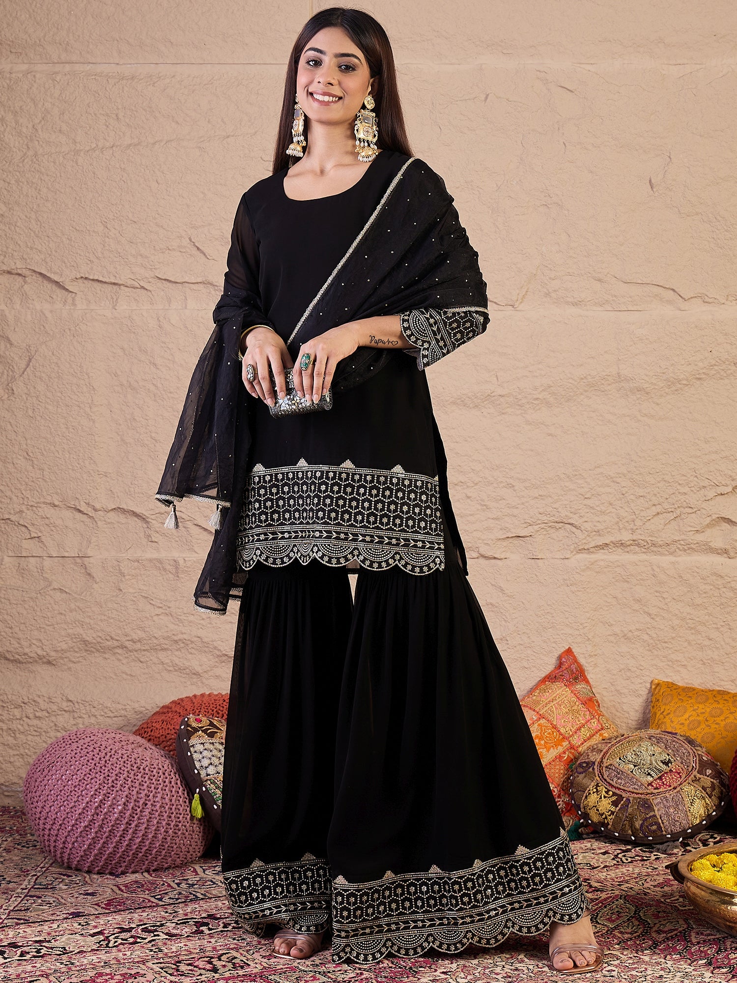 Black & silver embroidered kurta with sharara with dupatta