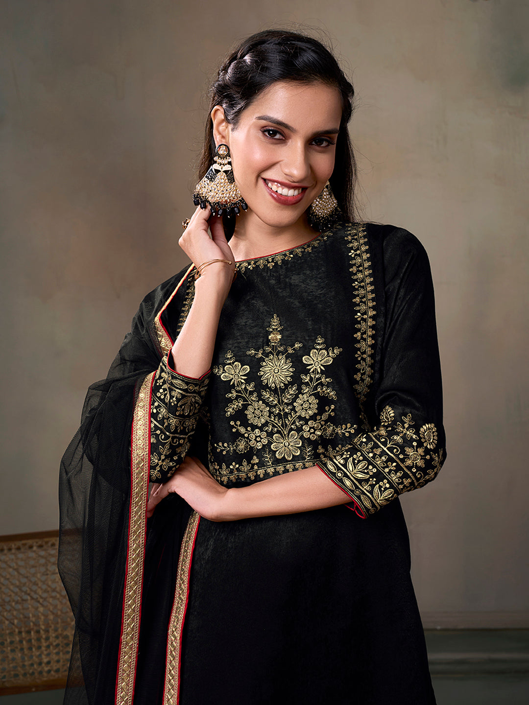 Elevate your ethnic wear collection with our embroidered velvet kurta set. Featuring a stunning black and gold design, the kurta is tailored with a straight shape and regular style, adorned with ethnic motifs. The velvet fabric adds a touch of luxury, while the trousers boast a partially elasticated waistband for comfort. Complete the look with a solid dupatta for a perfect finishing touch.