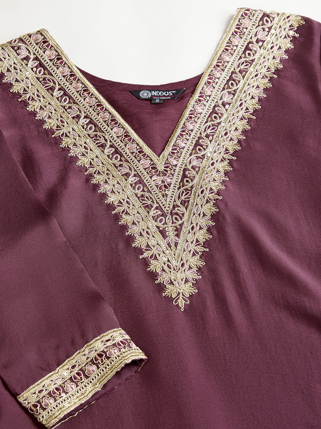 Burgundy, green and gold-toned yoke design kurta with trousers & dupatta