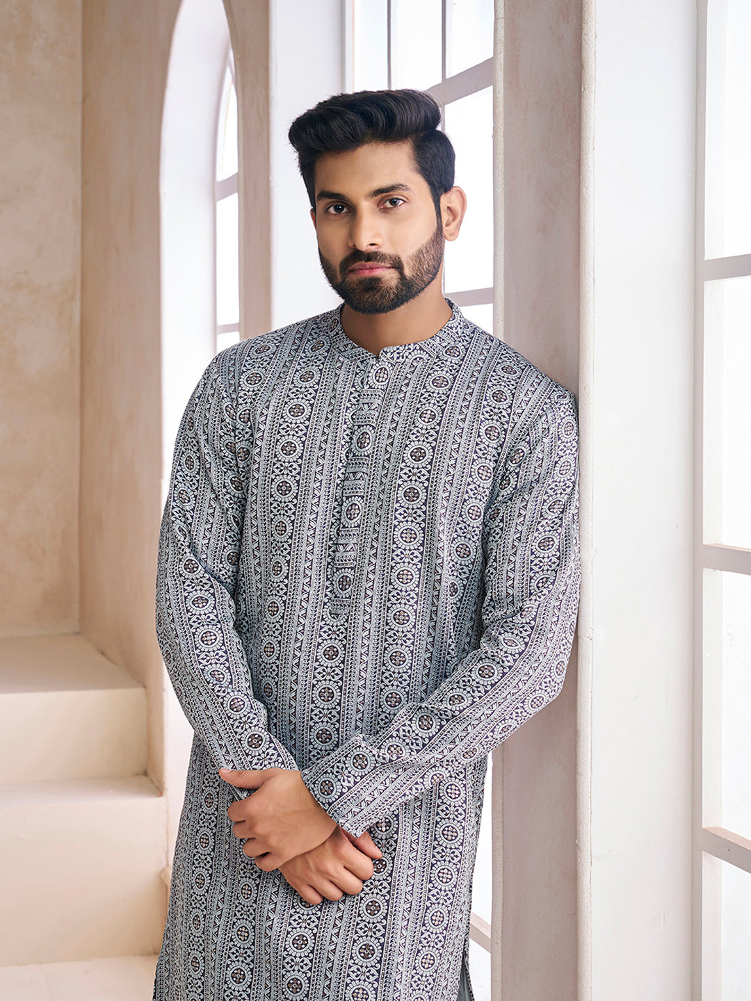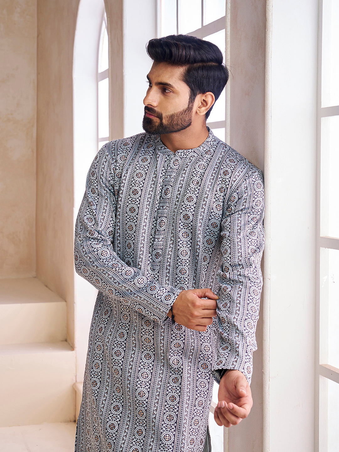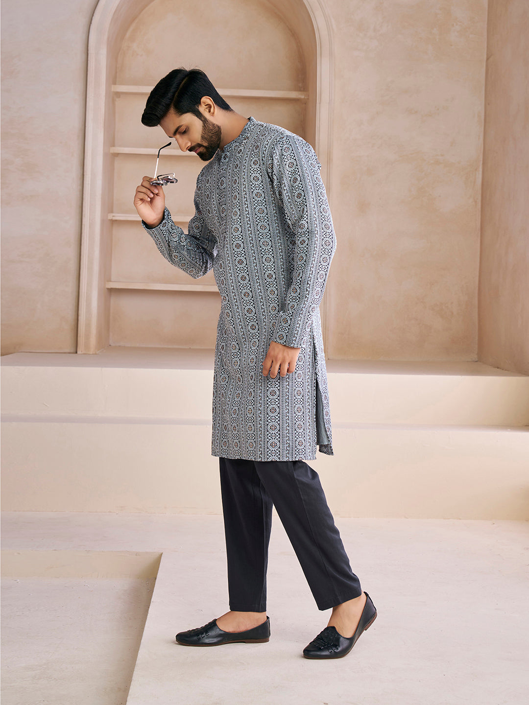 This grey and black Ethnic Motifs Printed Mandarin Collar Cotton Jacquard Straight Kurta is perfect for any occasion. The mandarin collar adds a touch of elegance to the ethnic motifs printing. Made from a machine weave regular cotton, this kurta is both comfortable and stylish. Dry clean recommended.