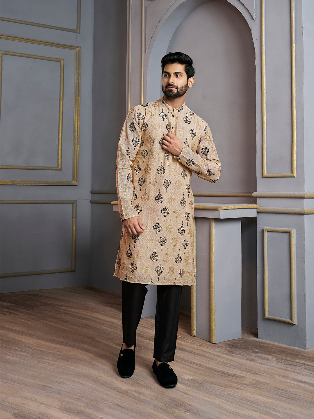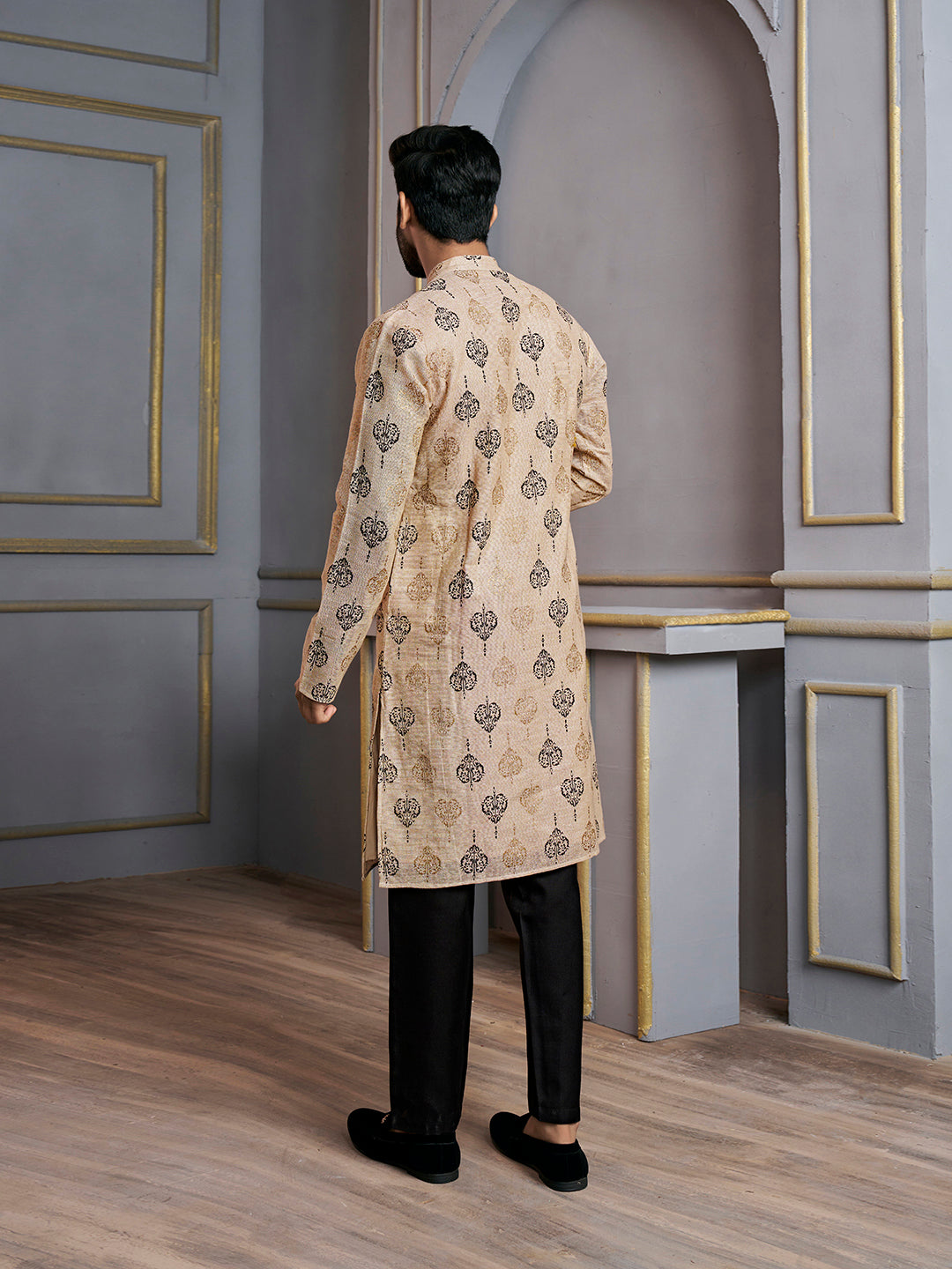 This beige jute silk kurta features ethnic print motifs and a sophisticated mandarin collar. With long, regular sleeves and a straight cut, it has a knee length hem. Perfect for any occasion, the machine weaving gives it a durable yet luxurious feel. Available in size M. Care instructions: dry clean only.