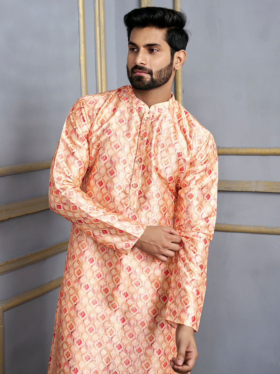 This silk blend kurta features an intricate ethnic motif print, adding a touch of traditional charm to your wardrobe. The mandarin collar and long sleeves elevate the look, while the straight shape and knee length provide a flattering fit. Perfect for any occasion, this kurta is machine-woven for durability and must be dry cleaned to maintain its vibrant yellow color. Available in size M, this kurta is a versatile addition to any wardrobe.