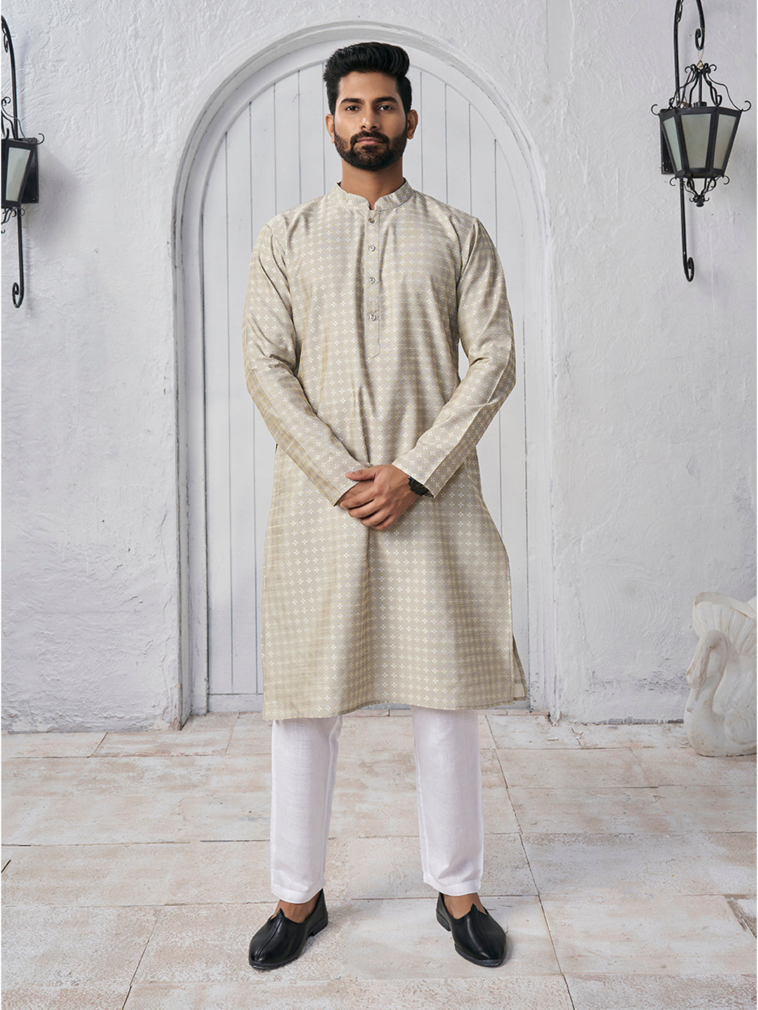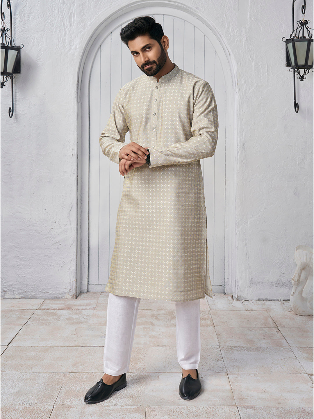 Elevate your ethnic style with our Ethnic Motifs Women Design Mandarin Collar Cotton Jacquard Straight Kurta. The cream-coloured kurta features a beautiful woven design and a classic mandarin collar. The long, regular sleeves and straight shape offer a comfortable fit while the knee length and straight hem add a touch of elegance. Made with machine-woven regular cotton material, this kurta is easy to care for with dry cleaning. Perfect for any occasion, it's a must-have for your wardrobe.