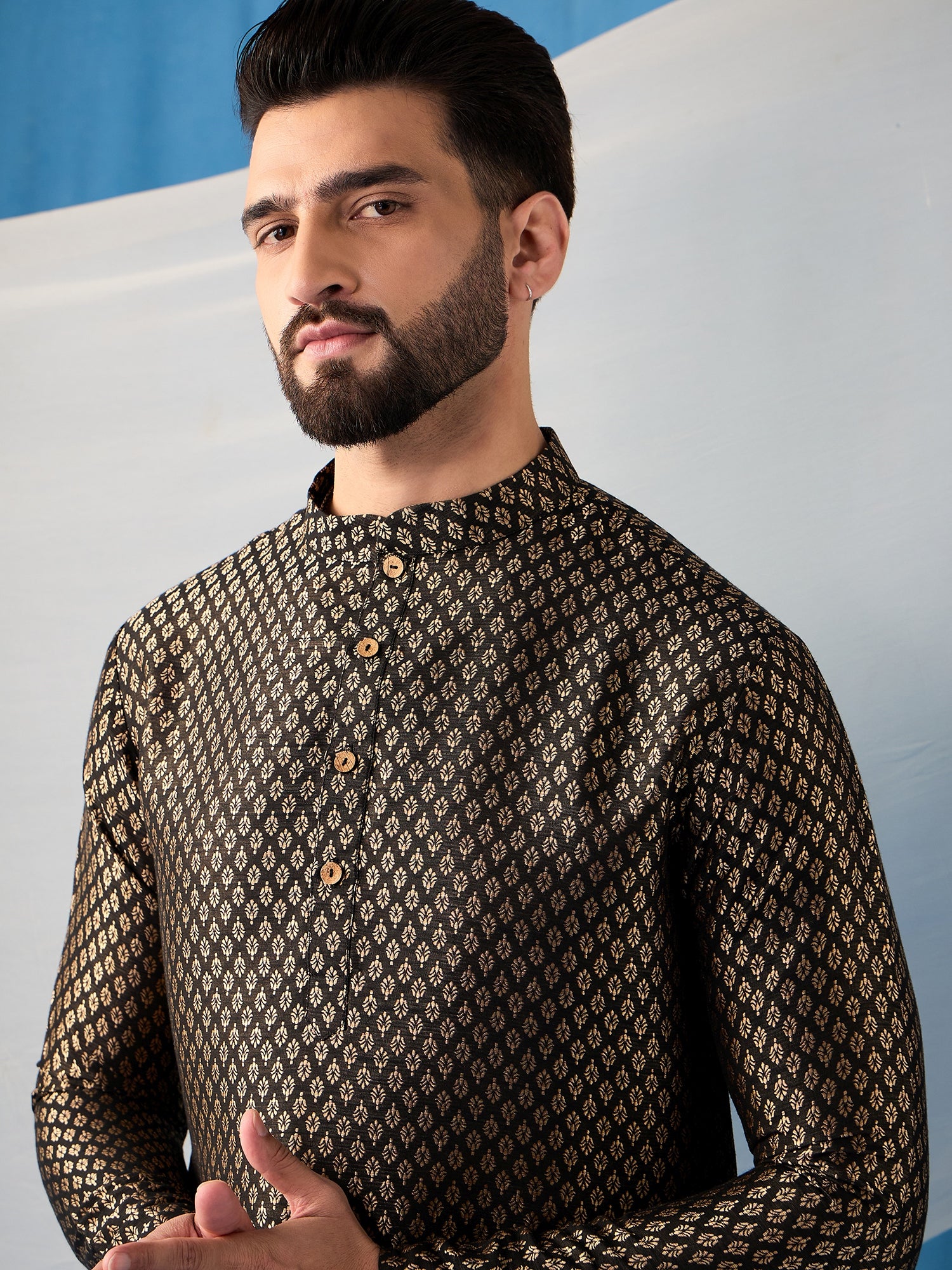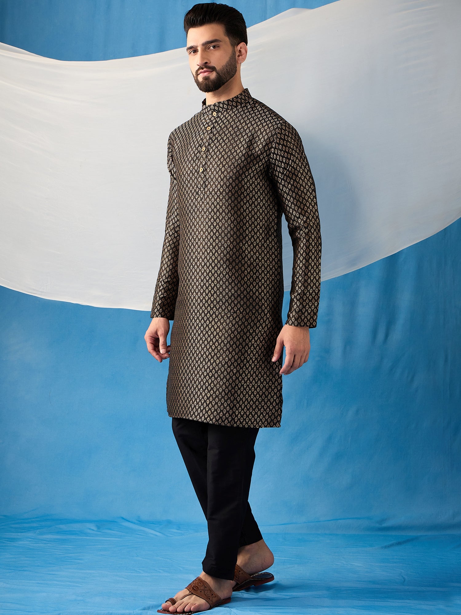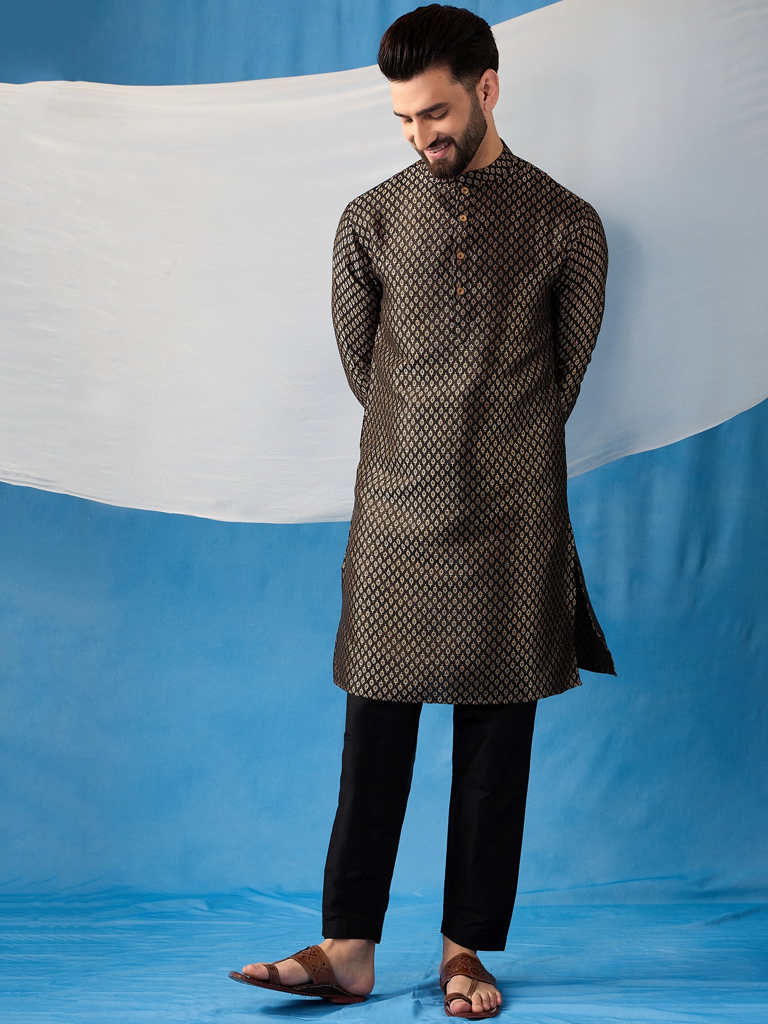 Expertly crafted, this Jacquard weave Kurta with Trousers boasts a stunning black and gold-toned woven design, inspired by ethnic motifs. The Mandarin collar and long sleeves add a touch of sophistication, while the silk blend fabric ensures breathability and comfort. The partially elasticated waistband and pockets in both Kurta and Trousers provide convenience and practicality. Elevate your ethnic wear collection with this elegant and stylish ensemble.