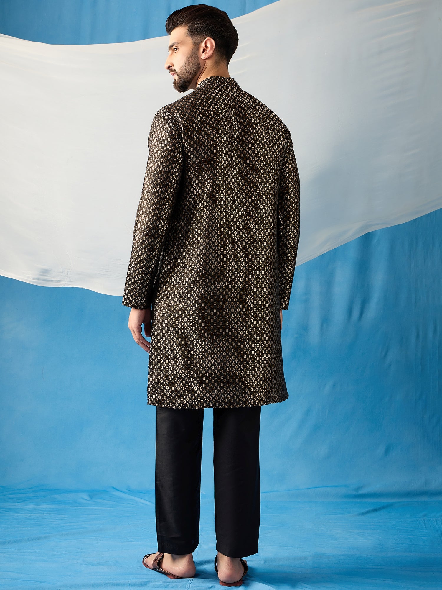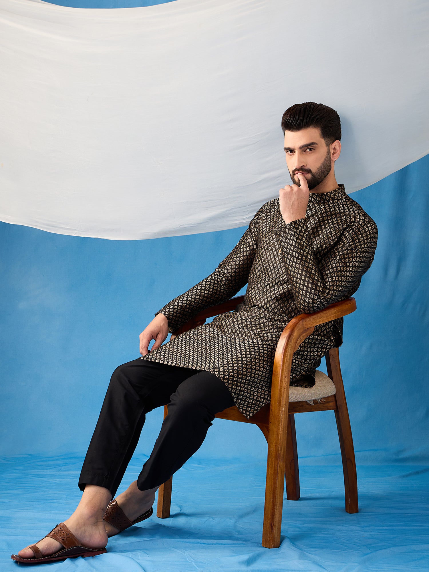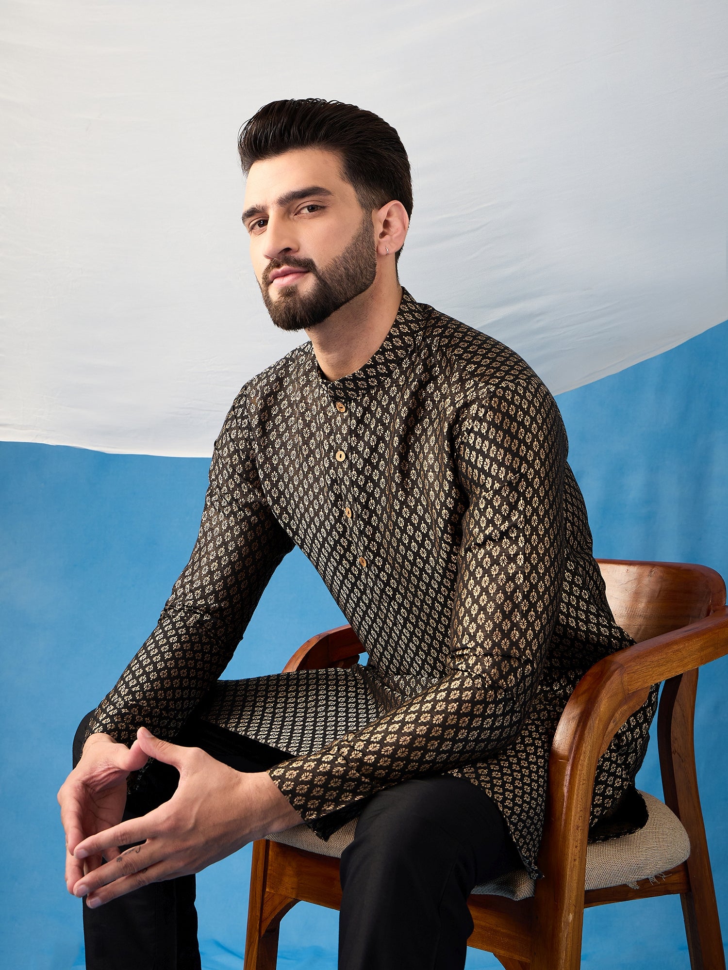 Expertly crafted, this Jacquard weave Kurta with Trousers boasts a stunning black and gold-toned woven design, inspired by ethnic motifs. The Mandarin collar and long sleeves add a touch of sophistication, while the silk blend fabric ensures breathability and comfort. The partially elasticated waistband and pockets in both Kurta and Trousers provide convenience and practicality. Elevate your ethnic wear collection with this elegant and stylish ensemble.