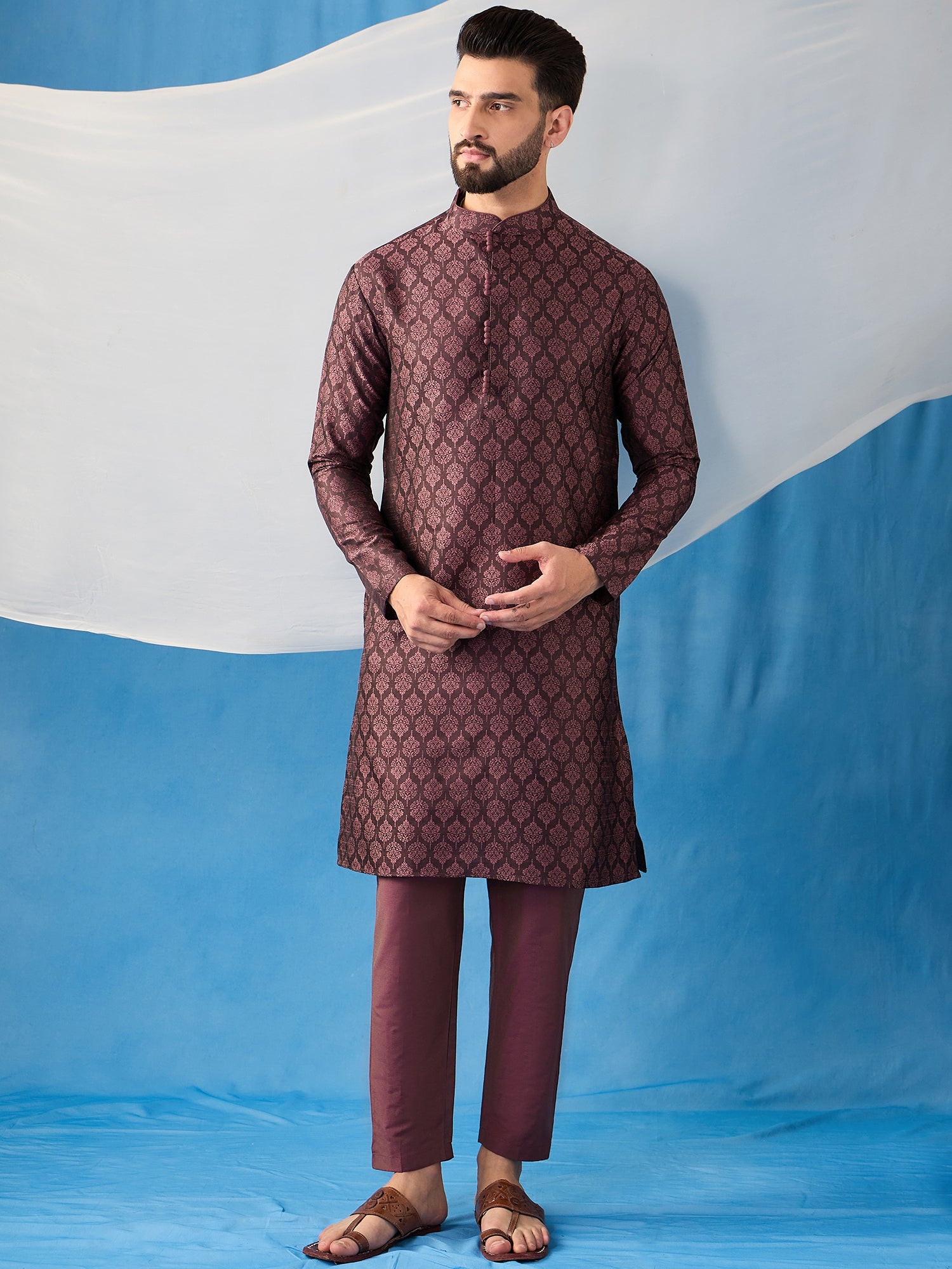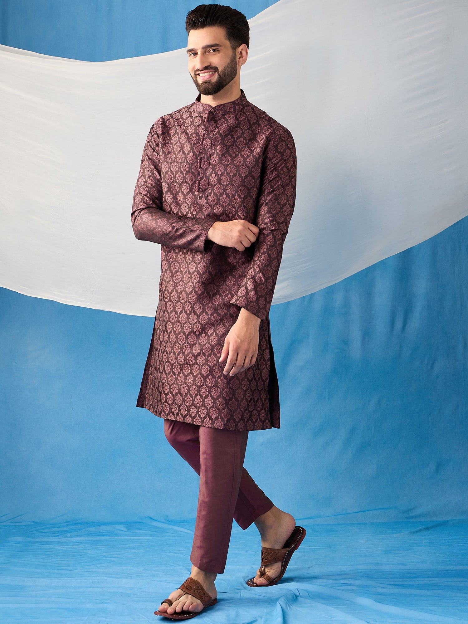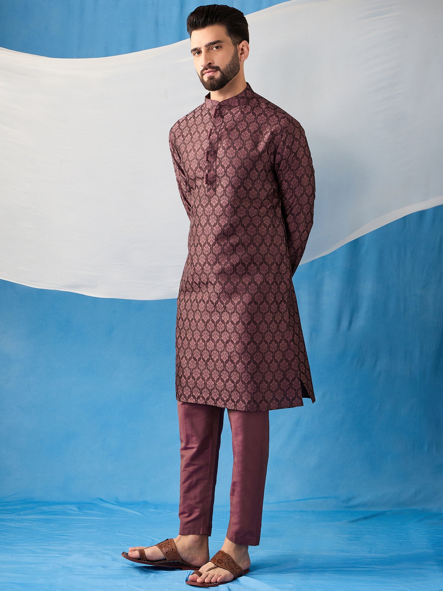 This mauve and brown Kurta features a beautiful ethnic motif woven design that adds an elegant touch. The mandarin collar, long sleeves, and knee length offer a classic yet stylish look. The accompanying solid trousers have a partially elasticated waistband for added comfort and a hook and eye with zip closure for convenience. Made with silk blend machine weave fabric, this set is perfect for any occasion.