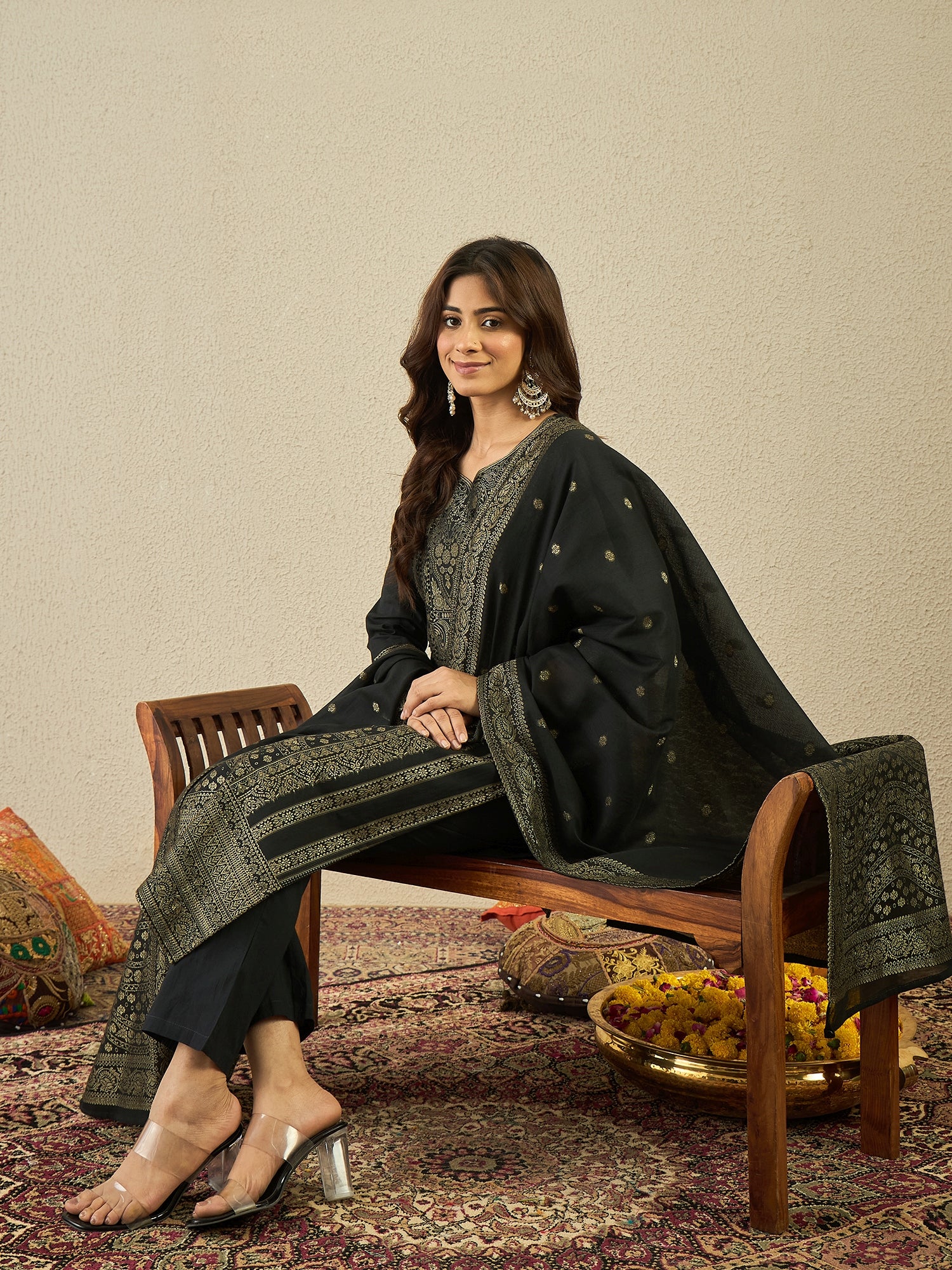 Black and gold-toned woven design Kurta with Trousers with dupatta