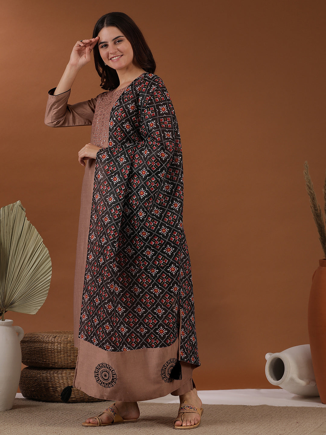 Introduce a touch of elegance to your wardrobe with this pink, black and white yoke design Kurta and Trousers set, complete with a printed Dupatta. Made from a silk blend and detailed with mirror work, this calf length Kurta features a notch neck and three-quarter sleeves. The partially elasticated waistband on the solid colored Trousers ensures a comfortable fit. Add a pop of color with the tassel detailed Dupatta. Dry clean recommended.