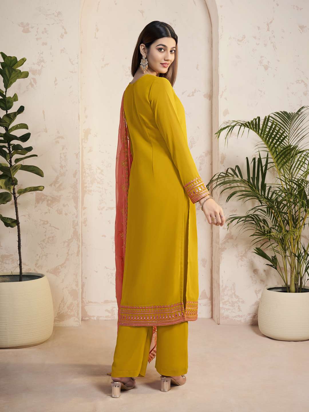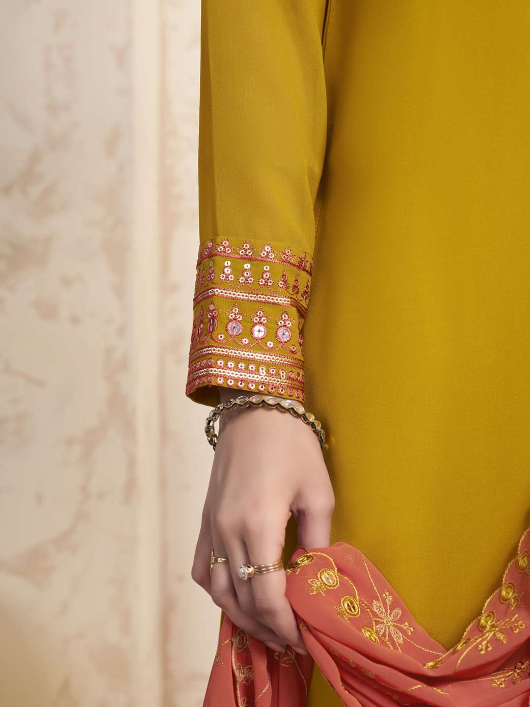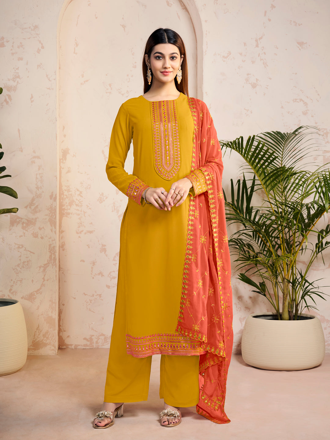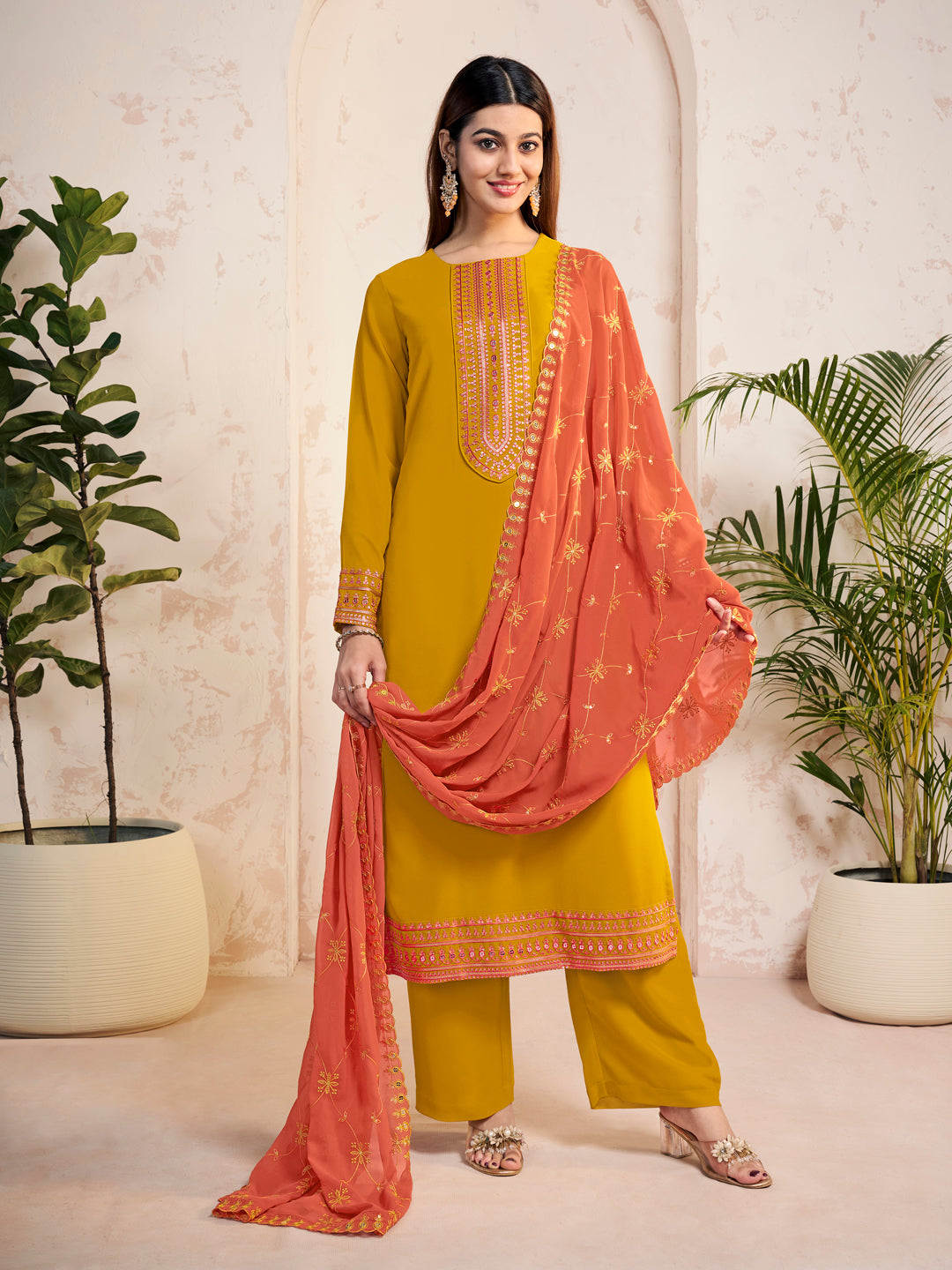 Elevate your ethnic style with our Mustard and Orange Yoke Design Kurta set. Featuring a stunning ethnic motifs yoke design, sequinned detailing, and a round neck, this Georgette Machine weave fabric kurta is perfect for any occasion. Paired with solid palazzos and an embroidered dupatta, this set offers both style and comfort.