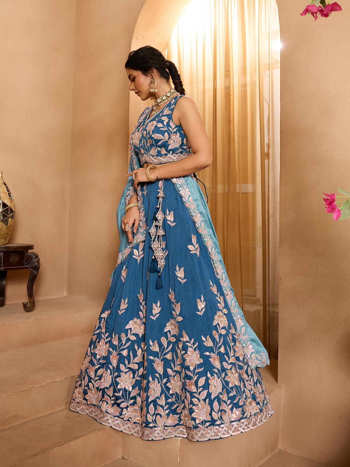 Lehenga:- Made of premium quality Teal Color with Silk fabric Full Flaire Semi-Stitched Lehenga With Breads and stone and Coding work has a thread Embroidery work. Has a thread cutwork border on the hemline.